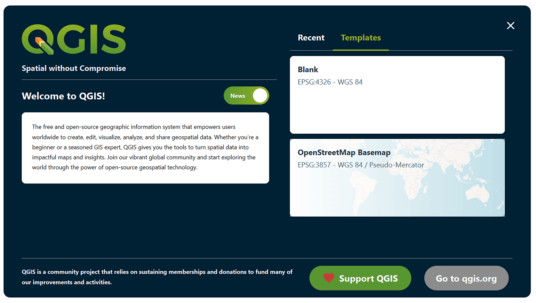 QGIS 4.0 features a significant user interface overhaul. Starting with the new start page, which is more structured and convenient for quick access to projects and tools.