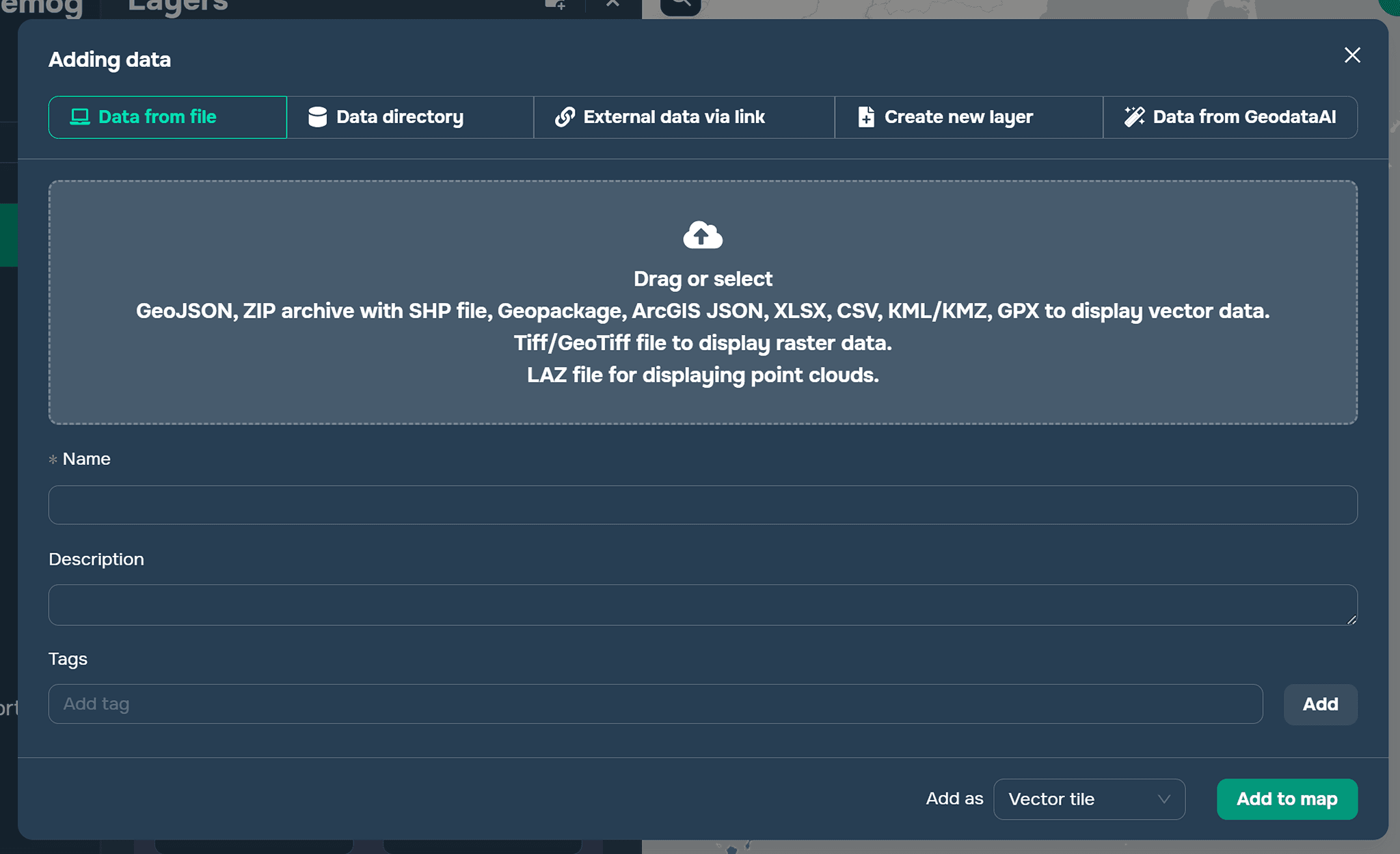 If you have a vector file with statistics (formats: geojson, geopackage, shp) or a tabular file (formats: csv, xls) with coordinates, then you're in luck! These are ready-made layers that can be added to the platform directly through the Add Data section.