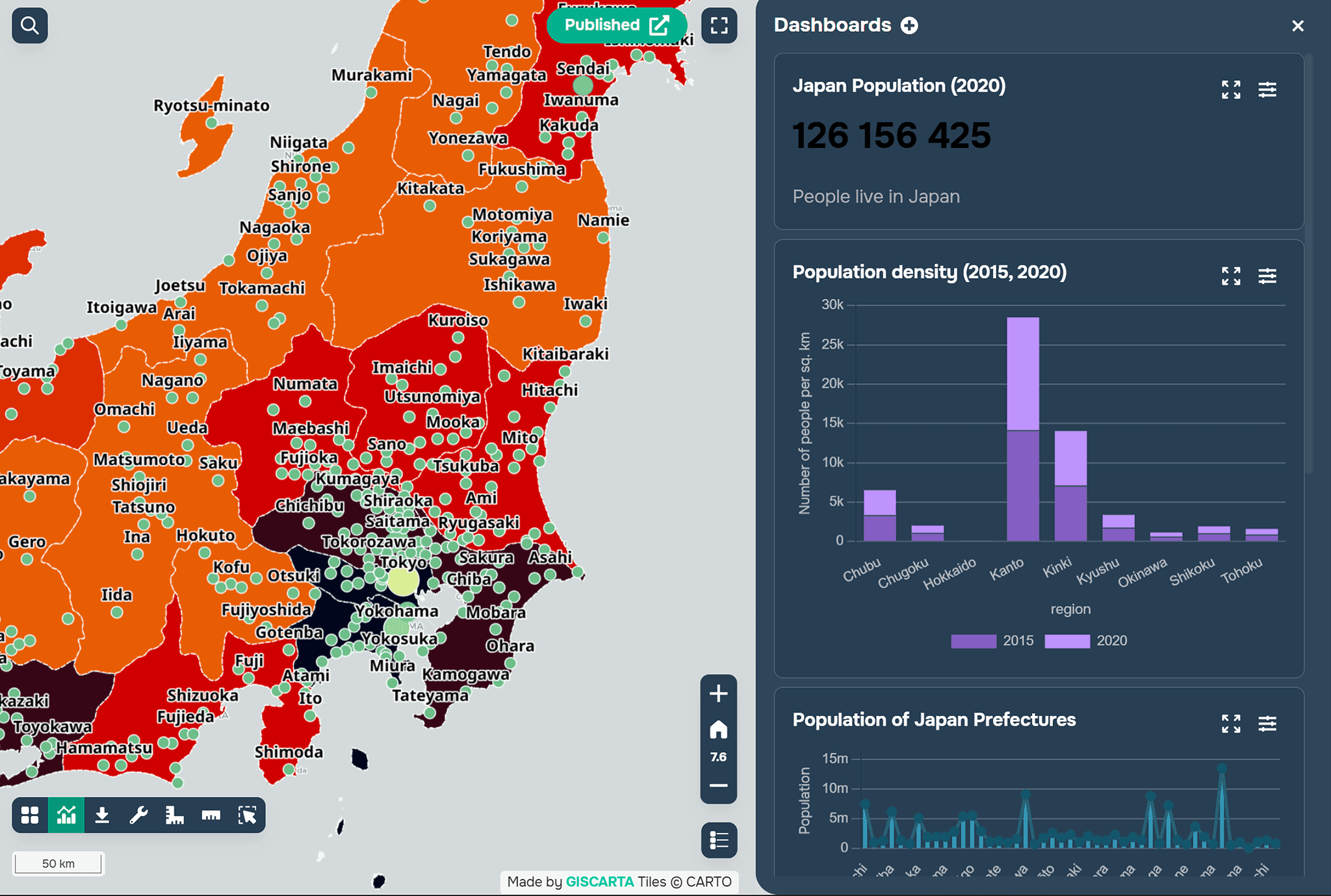 To prevent the map from becoming overloaded with data, you can add dashboards to the platform. These can display additional information in the form of graphs and charts. For example, you can add an age and sex pyramid as a graph in a dashboard.