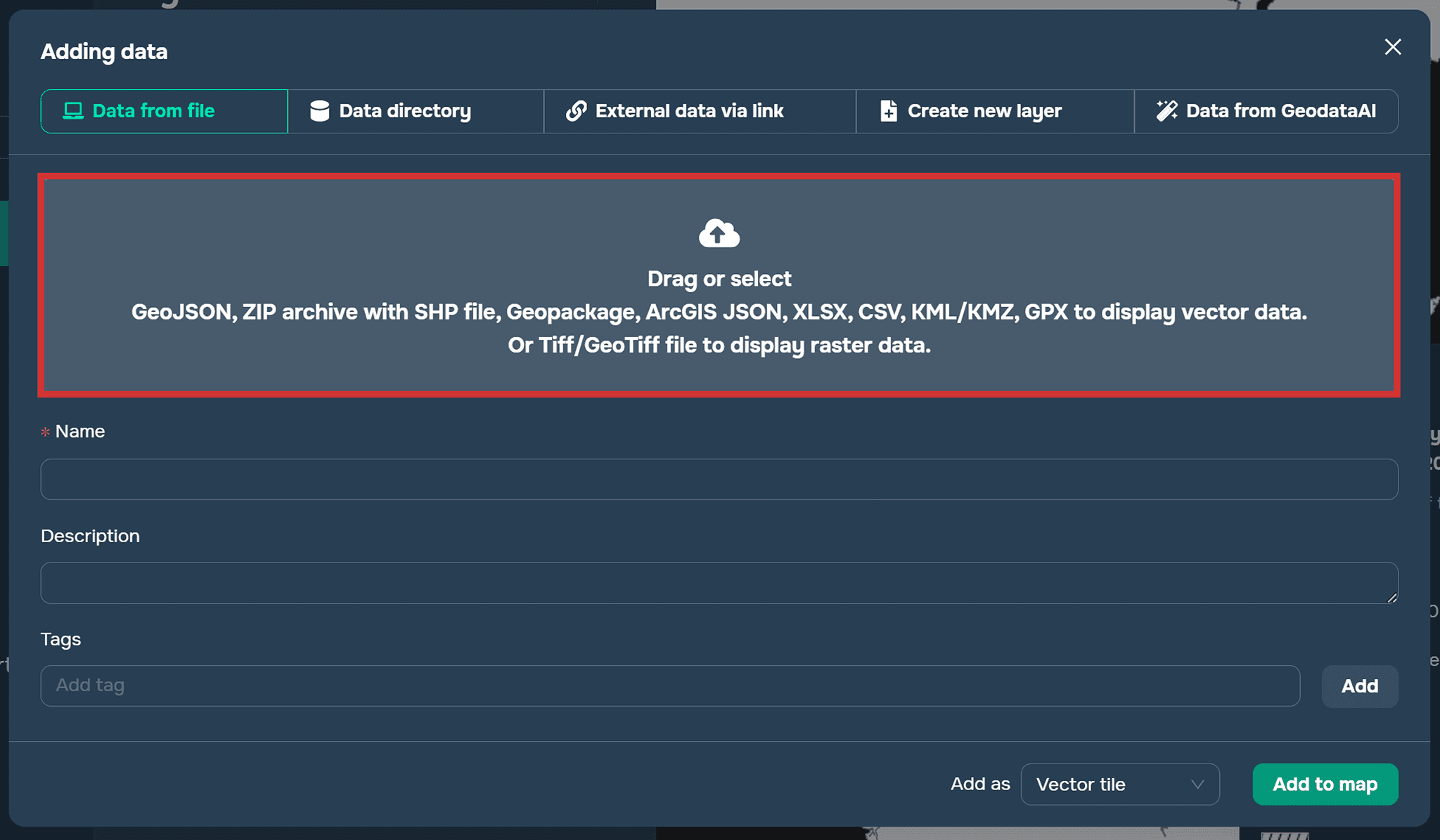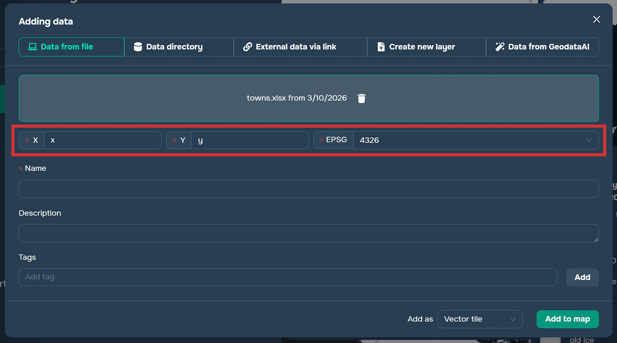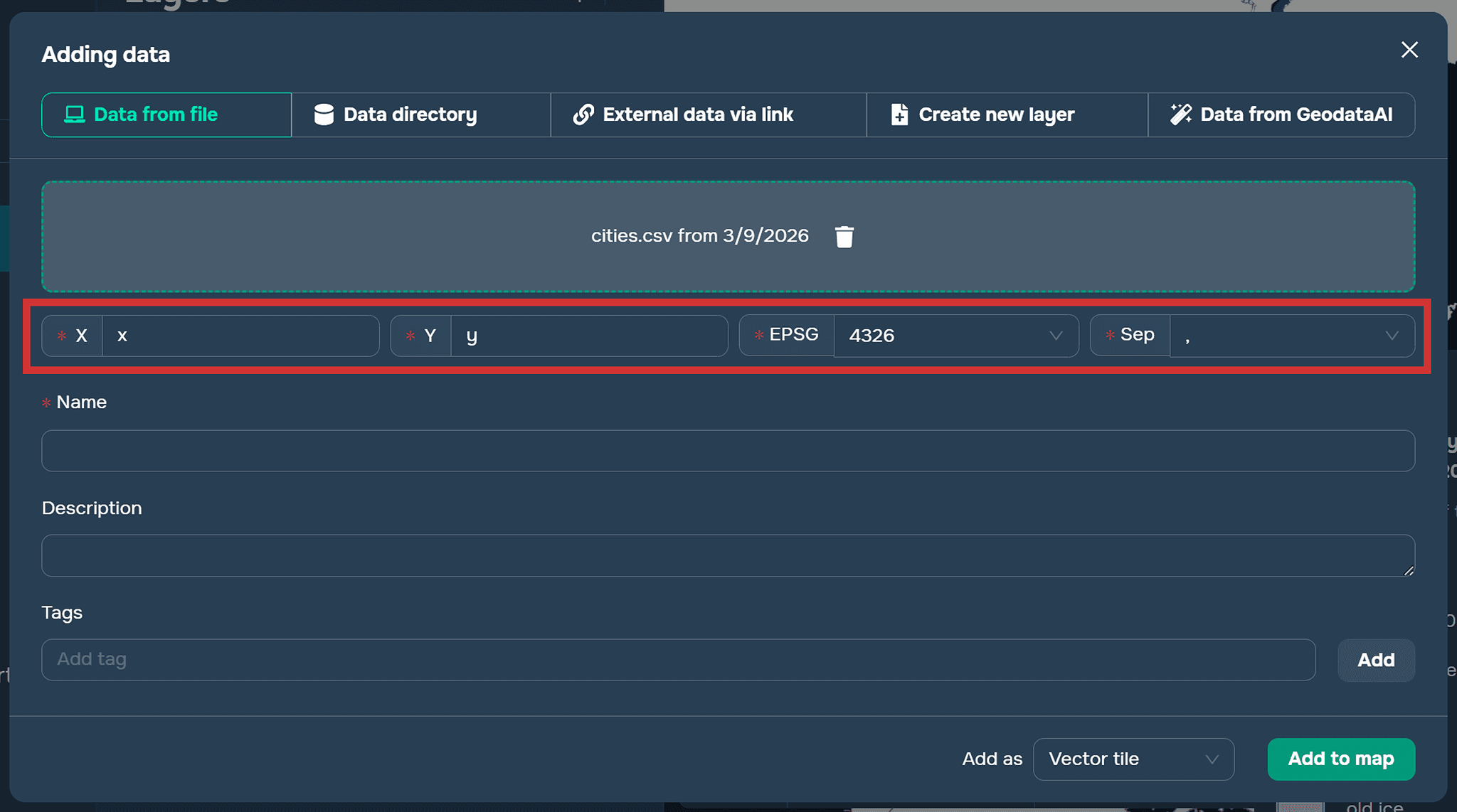 You need to go to the data addition window. Then drag the desired table into the window. To ensure the data is read correctly, you must specify the column names that represent the x- and y-coordinates, as well as the coordinate system. For a CSV file, you must also select a delimiter.