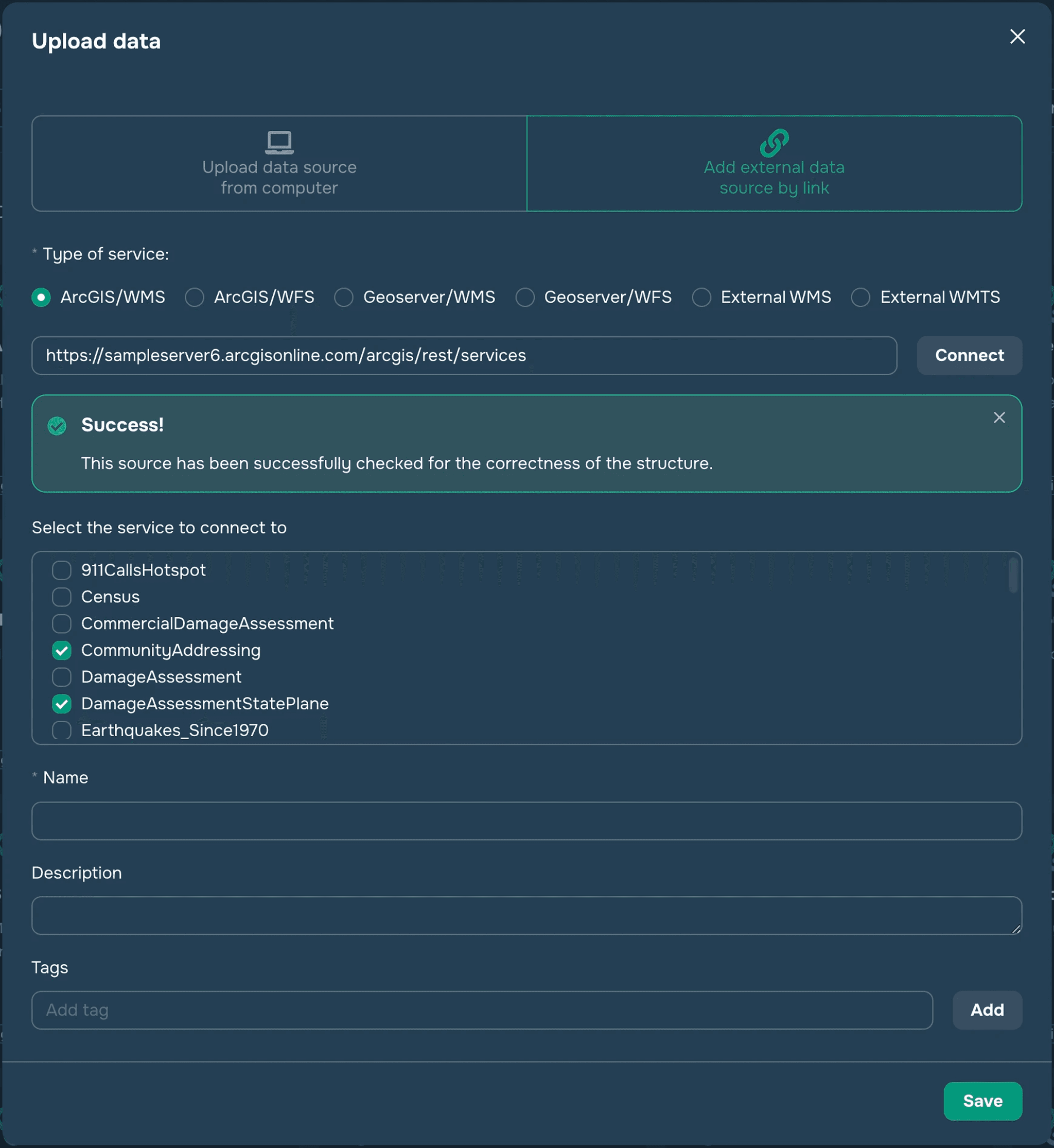 To connect an external data source, you need to first select the appropriate type of service: GeoServer or ArcGIS Server, then enter a link that leads to a list of services, for example: