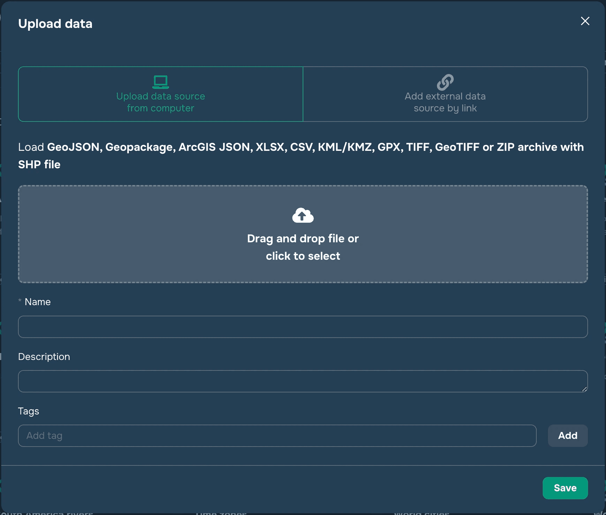 You can upload vector data in GeoJSON, Excel, CSV, KML, GPX, ArcGIS JSON, or ZIP archive with a SHP file, as well as raster data in TIF format and point clouds in LAZ format.