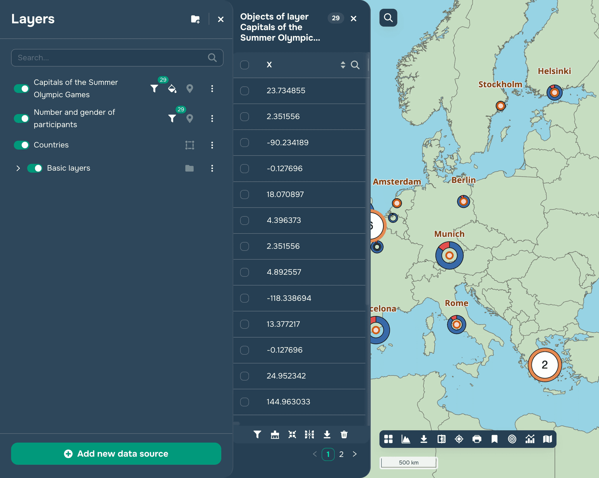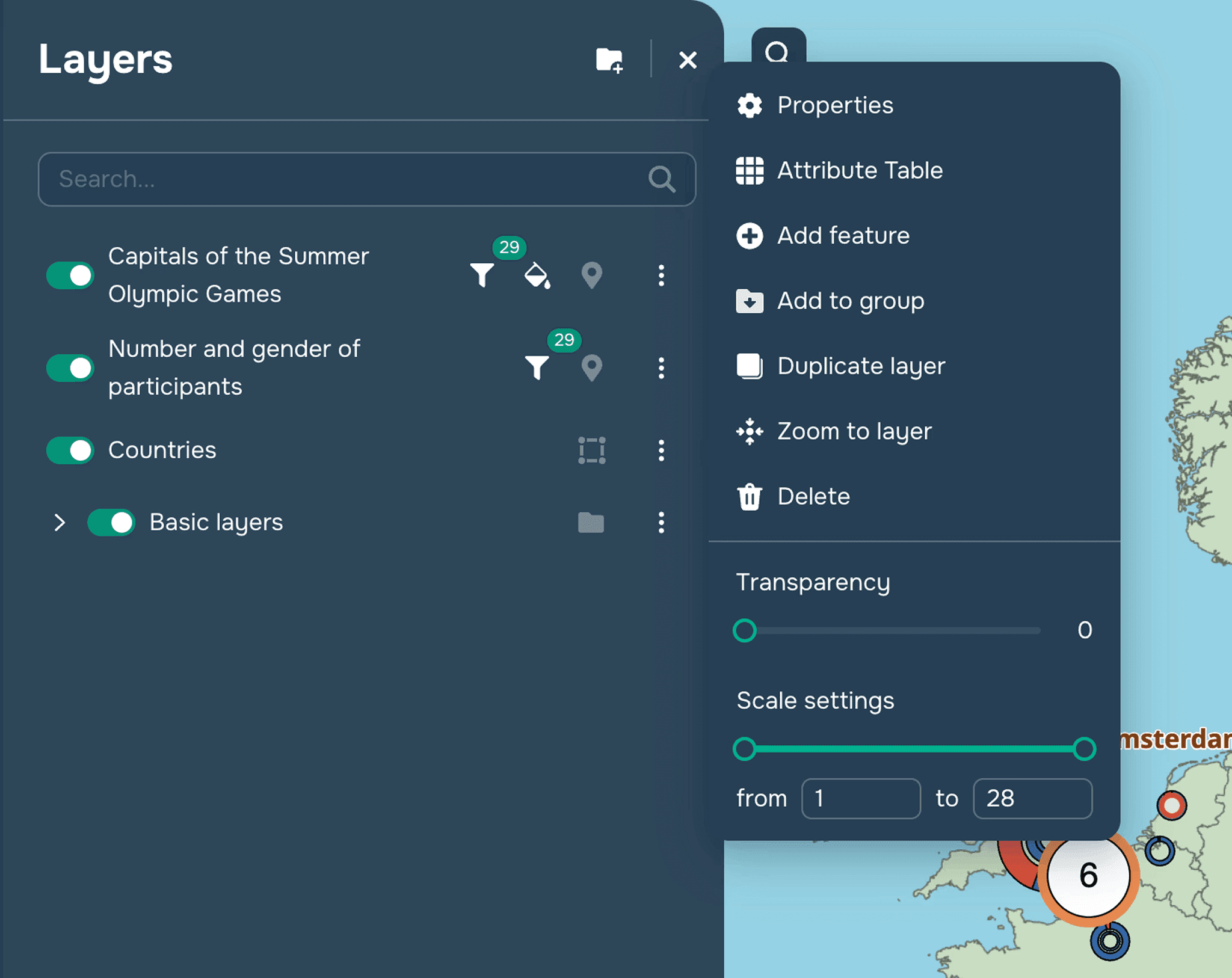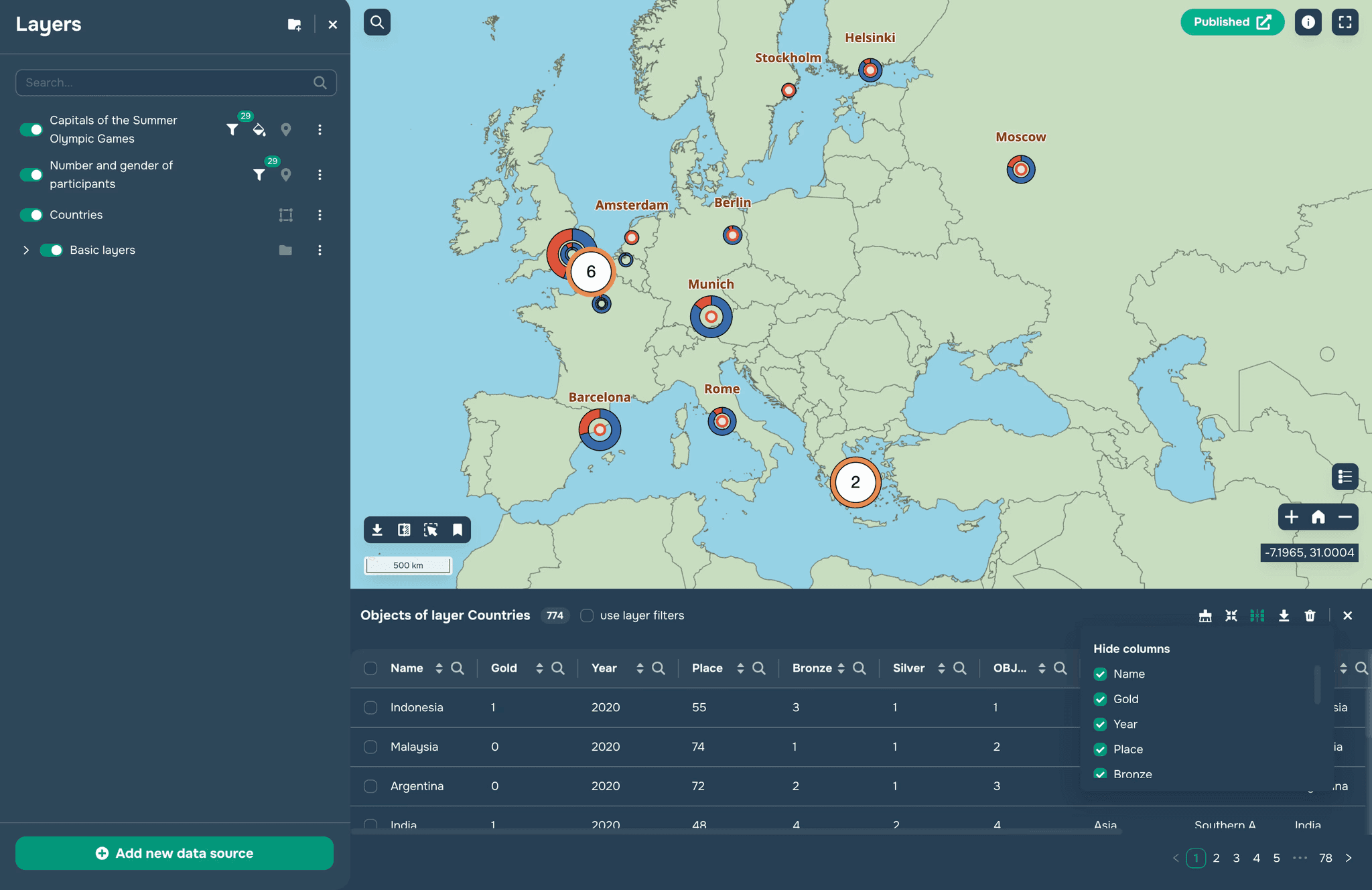 To view the attributes table, select the layer of interest and click the three dots next to it's name. Next, select the "Attribute table" section, then the attribute table of the selected layer will open in the lower part of the map (see Figure 2). The user can also customise the display of the columns in the attribute table by clicking the corresponding button in the upper right corner of the widget (see Figure 2).