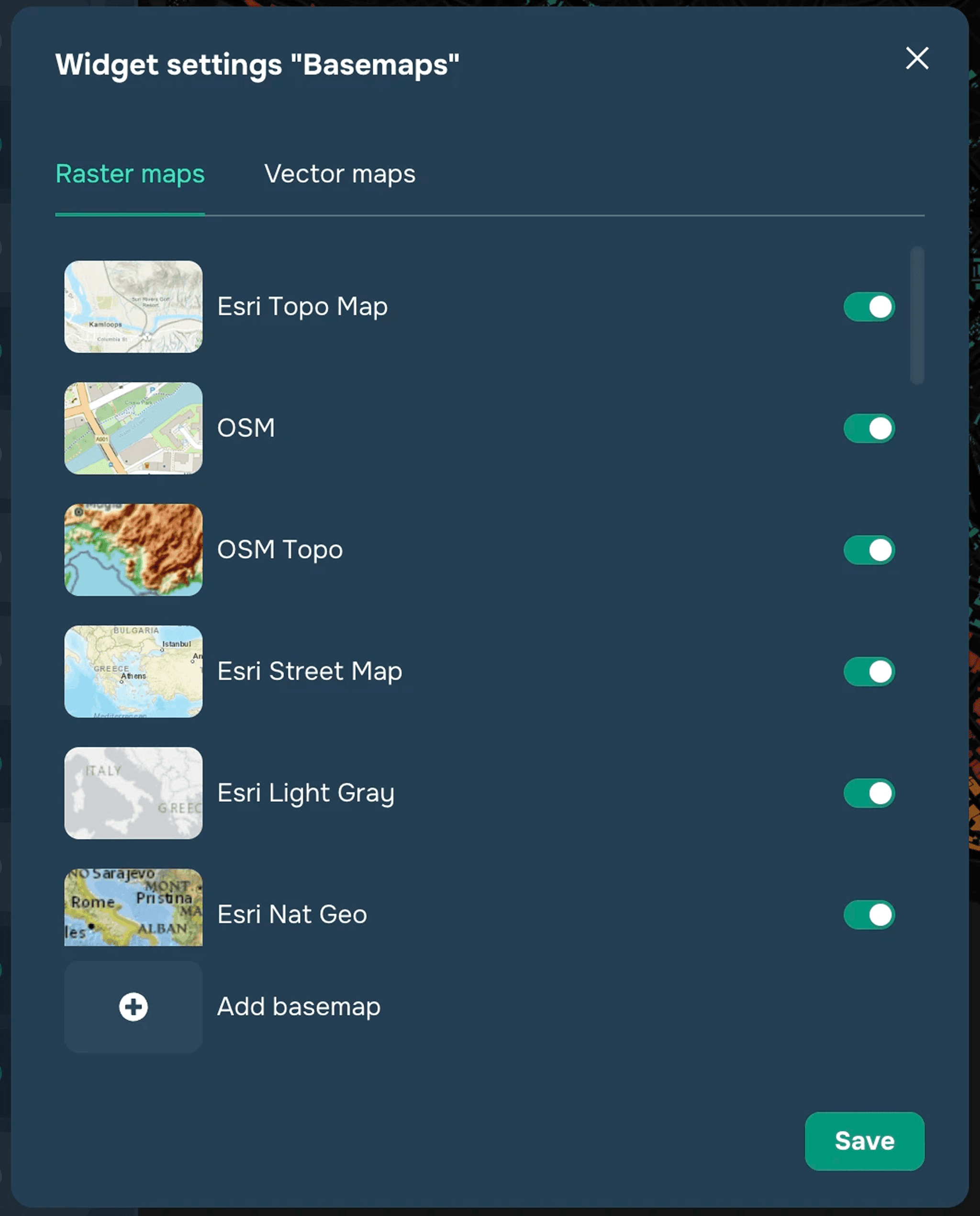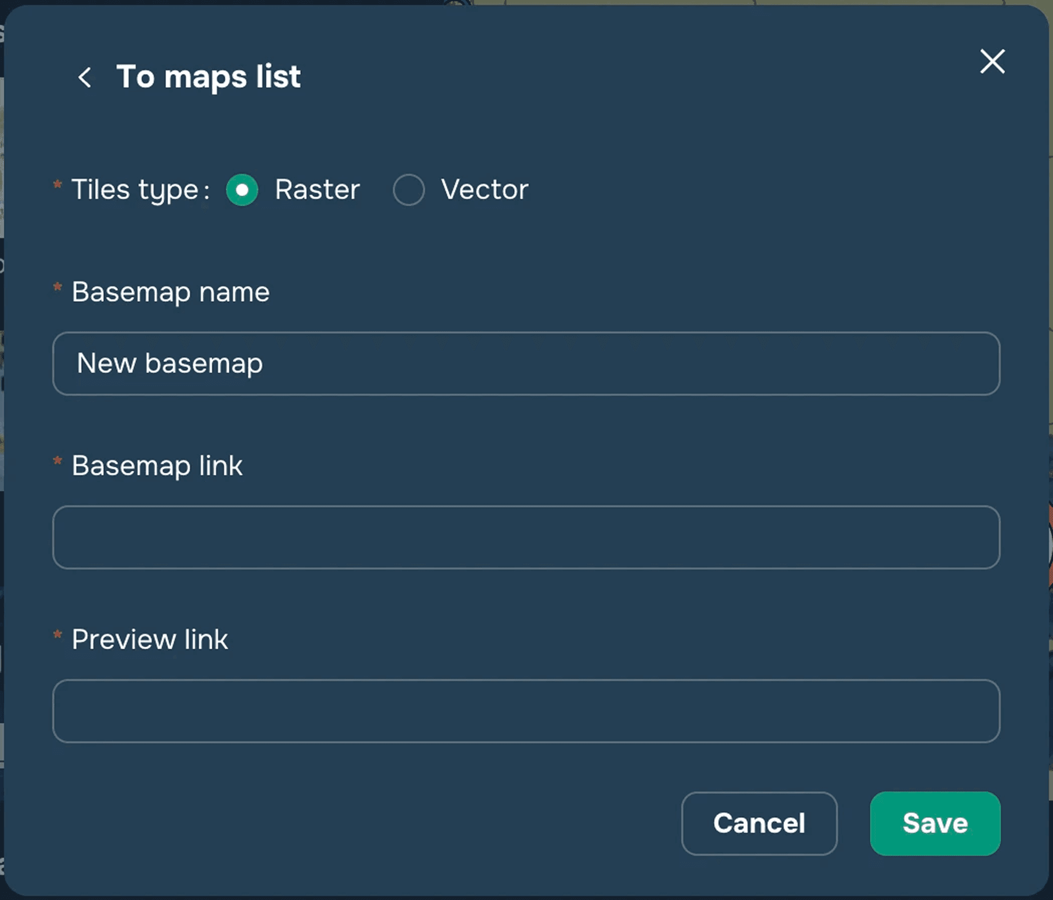 To upload a basemap, click "Add Basemap". Here you can add both a raster and vector tile basemaps. To add a basemap, you will need to create a name for it in the window that appears and paste the map link and the preview link.