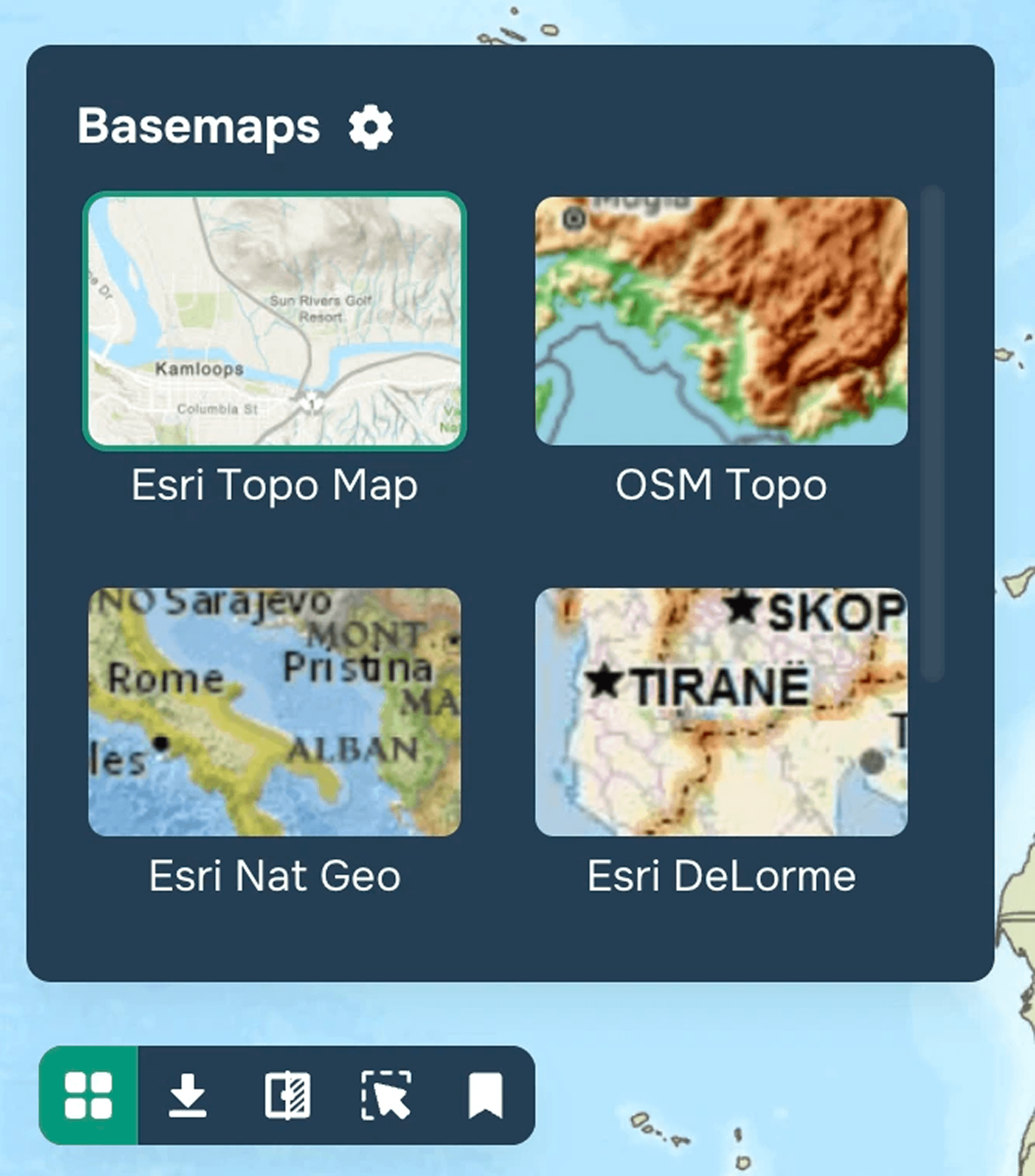 In the drop-down dialog box you will see raster and vector basemaps (substrates) available for selection, for example: OSM (Open Street Map), Open Topo map, Topo, Google, ESRI World Street Map, etc.