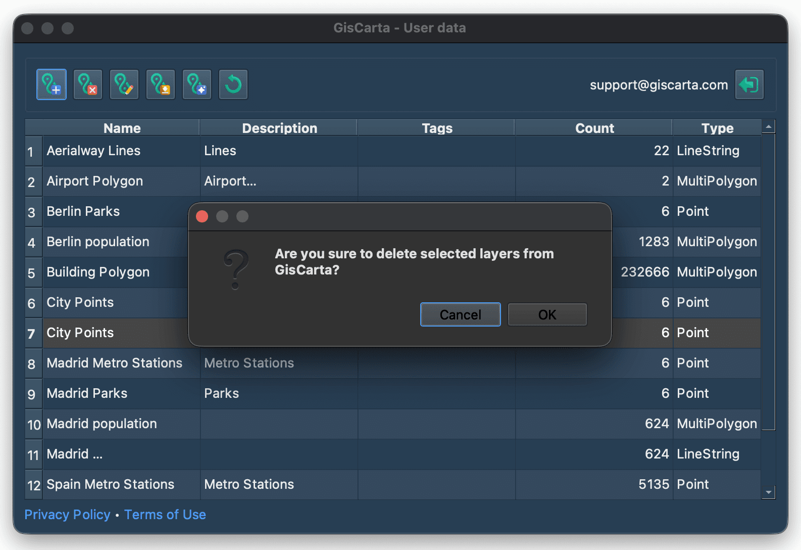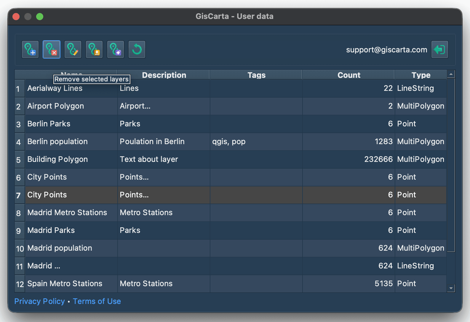 To delete a layer from the GISCARTA platform, you need to select a line in the list of layers by clicking on the line number.