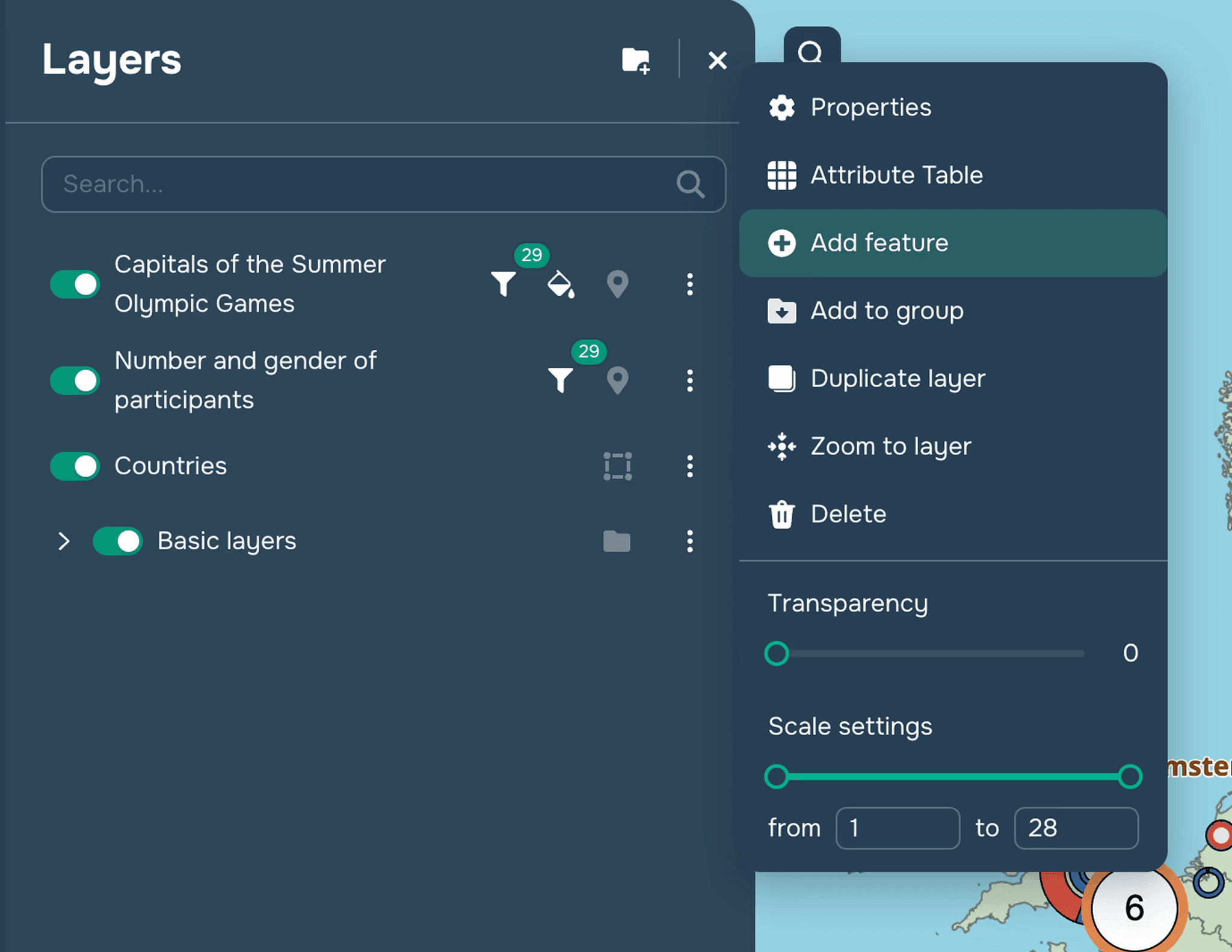 To add a new object, the user can click on the Add feature button in the context menu of the layer (see Figure 3) or click on the Add object button in the editing mode of an existing object (see Figure 2).