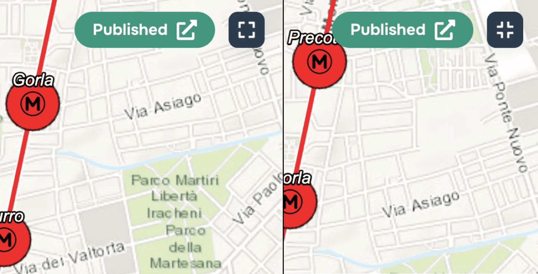 The "Full screen" widget allows you to expand the map to full screen. To activate the widget, you need to click on the corresponding button in the upper right corner of the map (left Figure). To exit full-screen mode, you must press the Esc button on your keyboard or the widget button in the upper right corner of the map (right Figure).