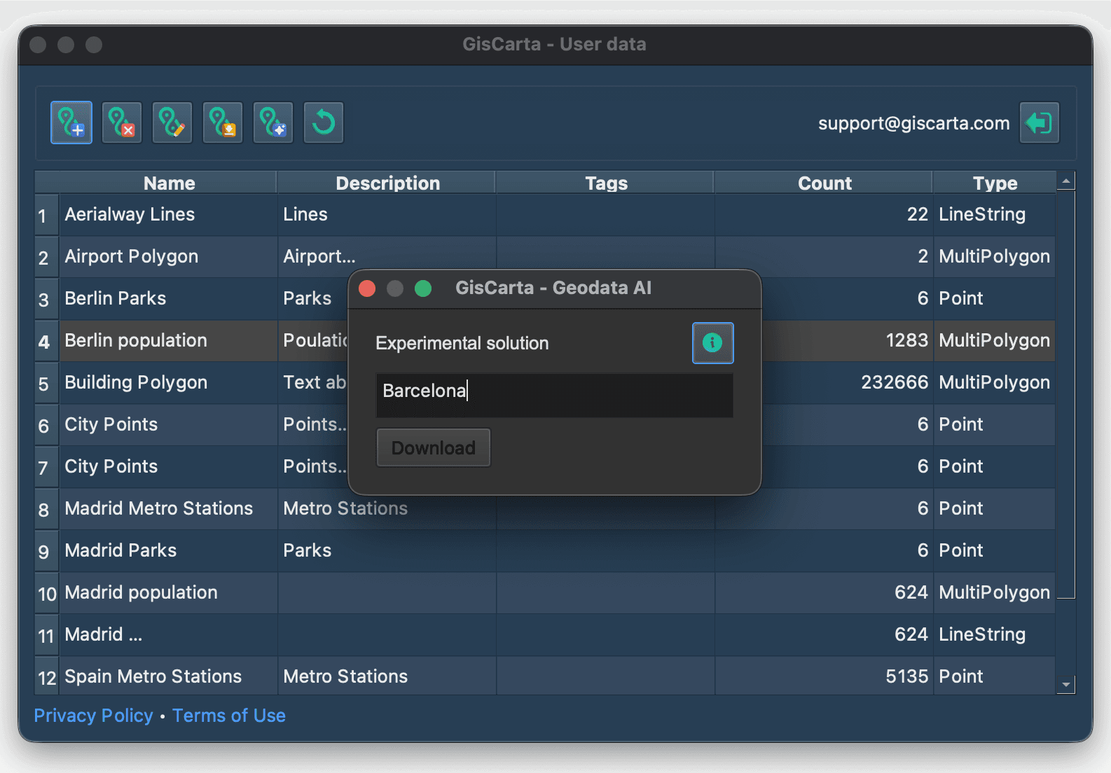 To use the Geodata AI feature, click the fifth icon from the left. A modal window will appear for entering a text query.