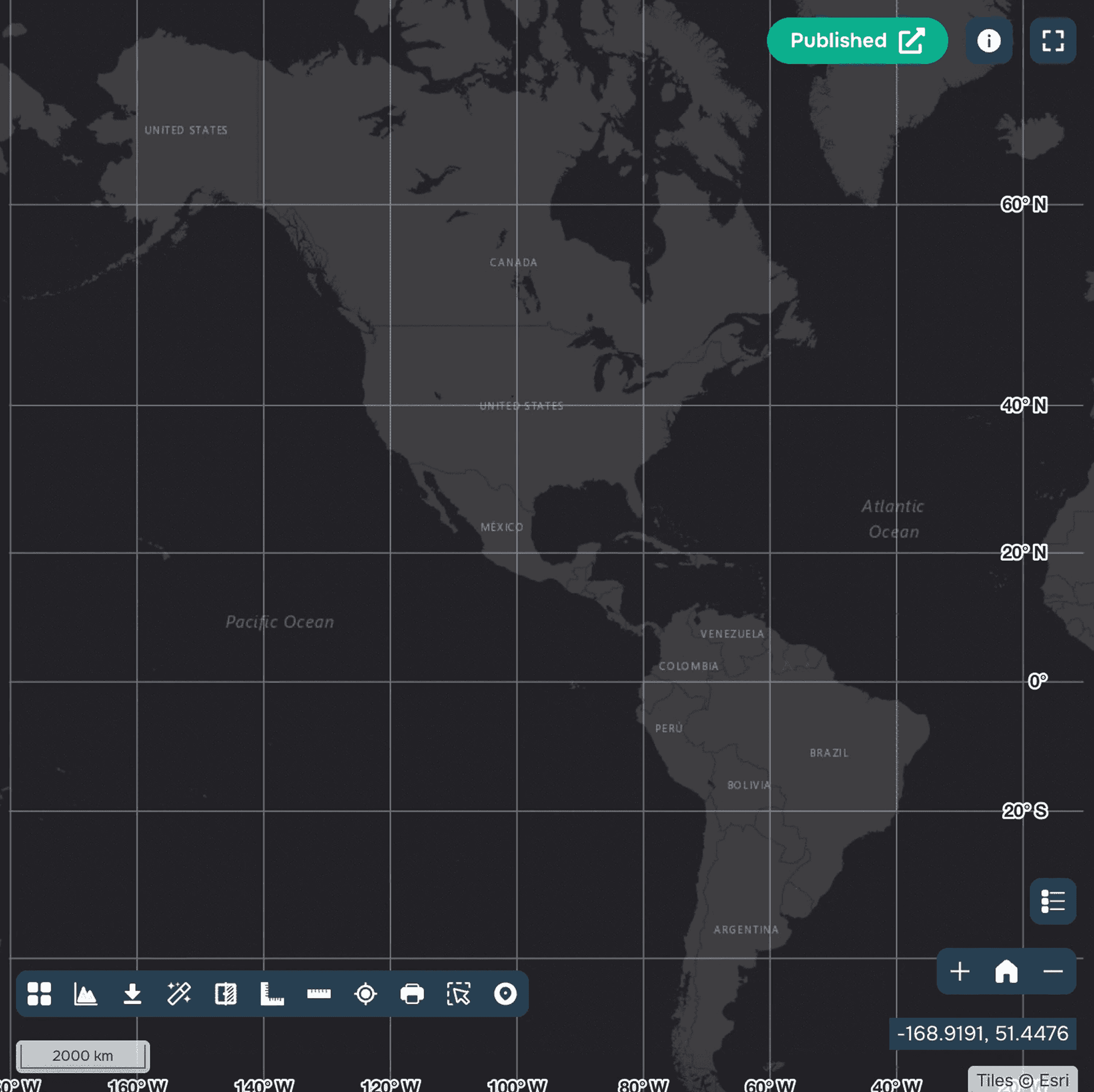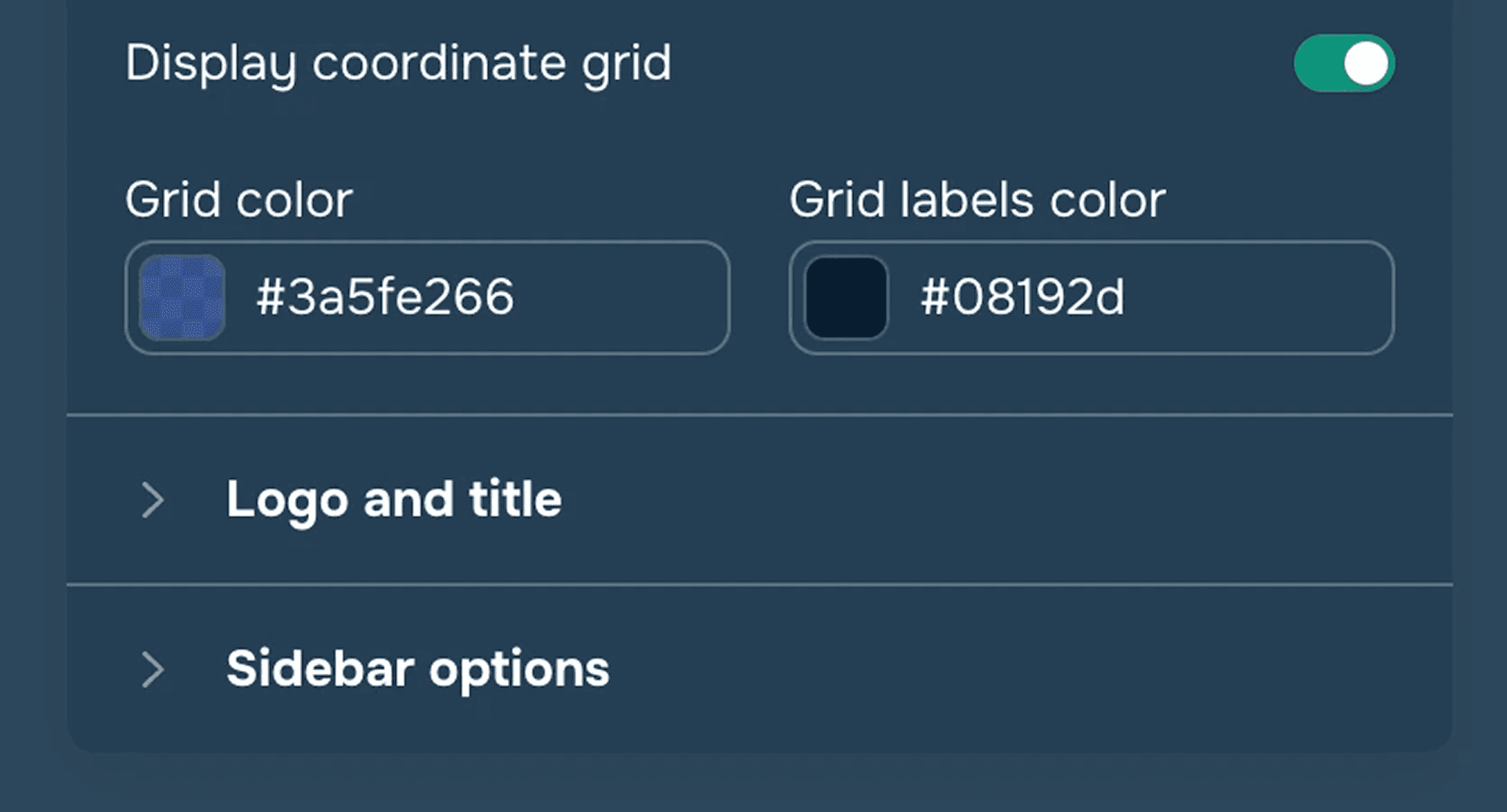 When the Grid widget is added to the map, a section will appear in the Map Parameters menu that allows user to enable or disable the display of the coordinate grid on the map. You can also customize the color of grid lines and grid labels (see Figure 1).