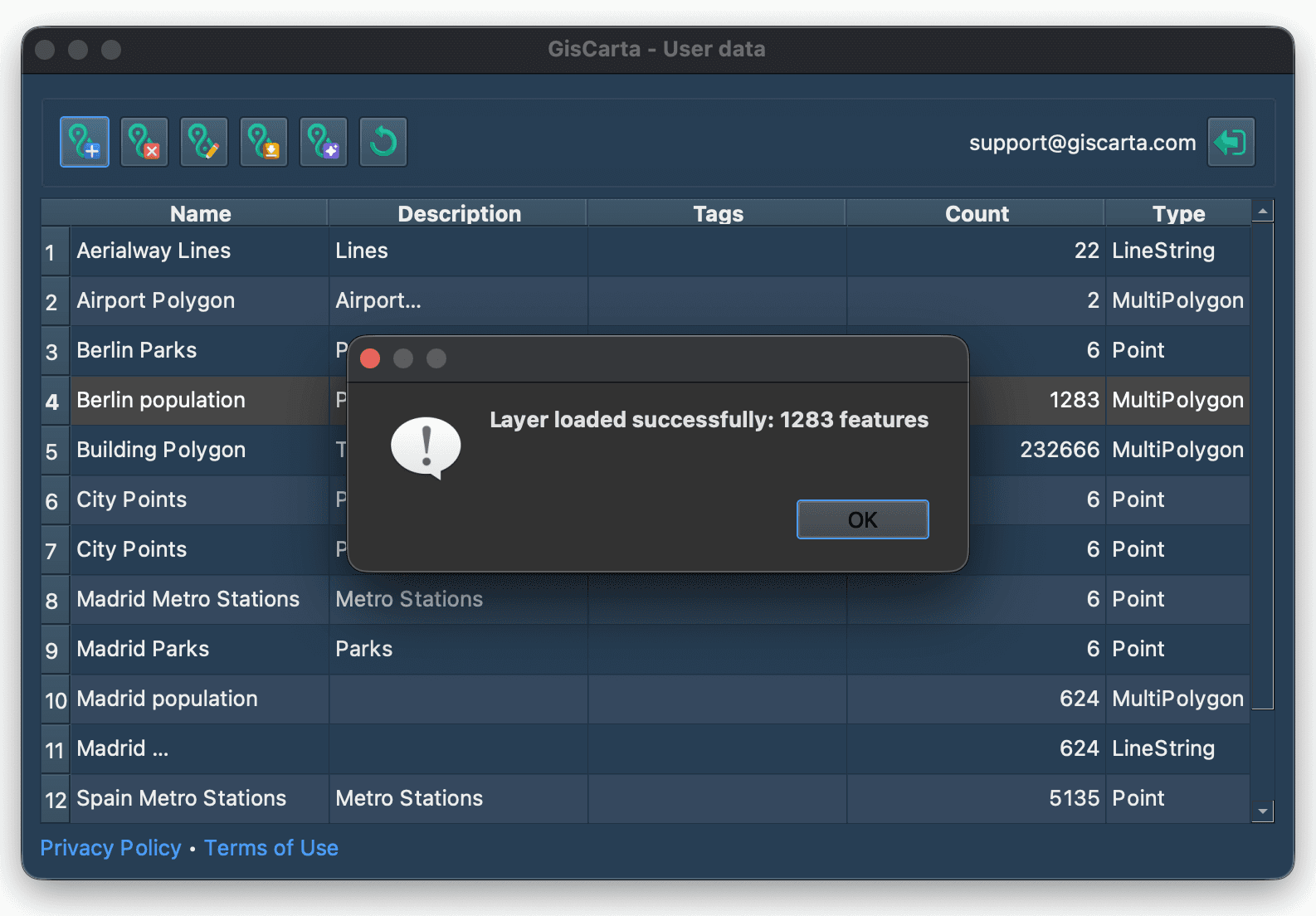 Once the layer has been successfully imported into the project, you will see a message indicating the number of objects that have been imported.
