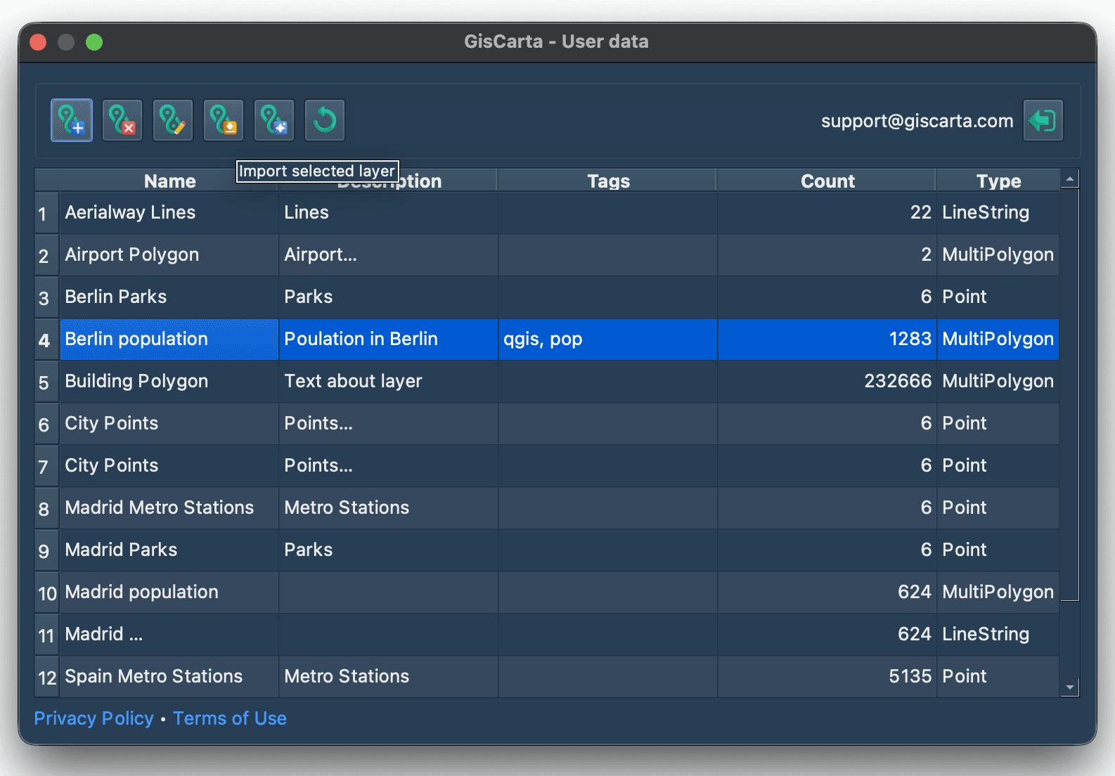 To import an existing GISCARTA layer into a QGIS project, select the row in the layer list by clicking on the row number. Then, click the Import Layer icon (fourth from the left).