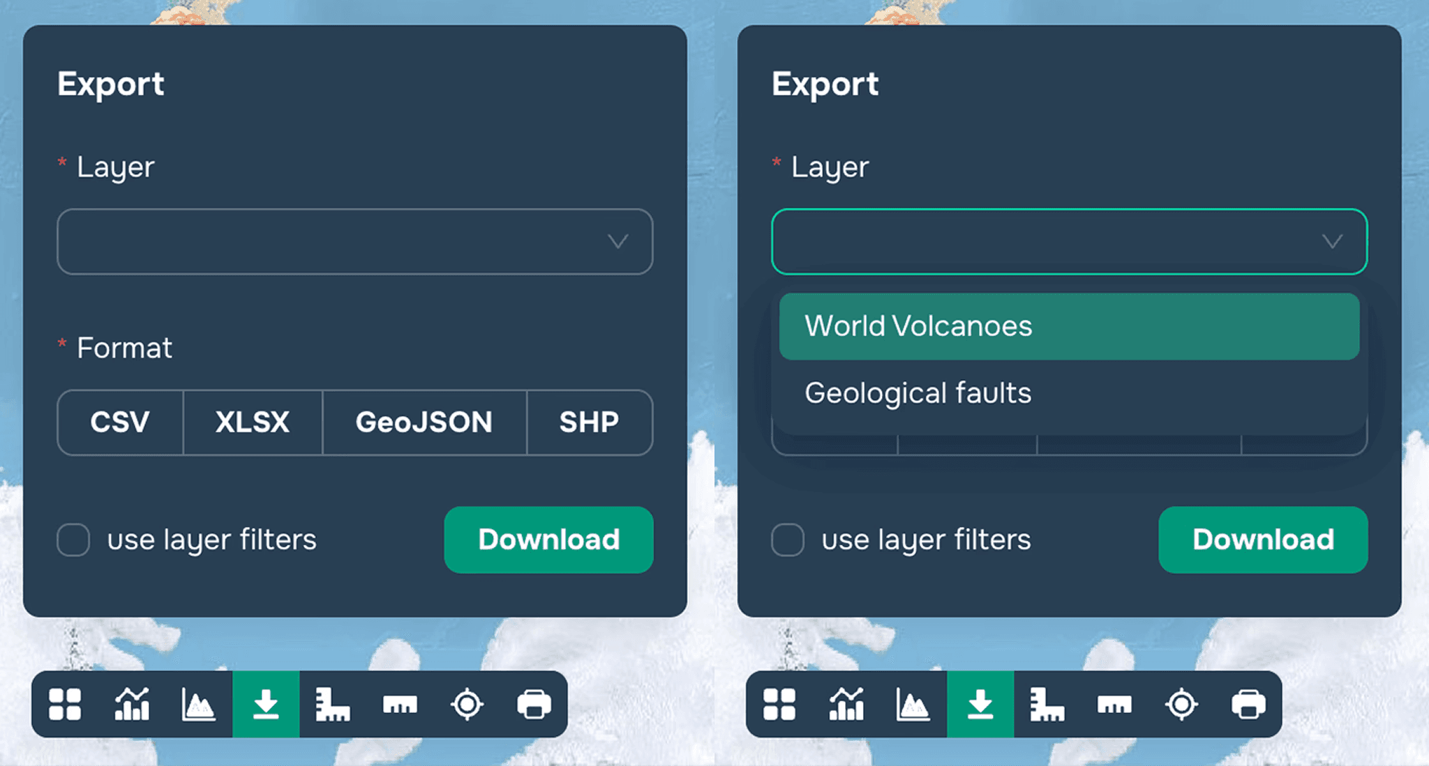 1. Press the "Export" icon in the lower left corner of the map to open the widget window