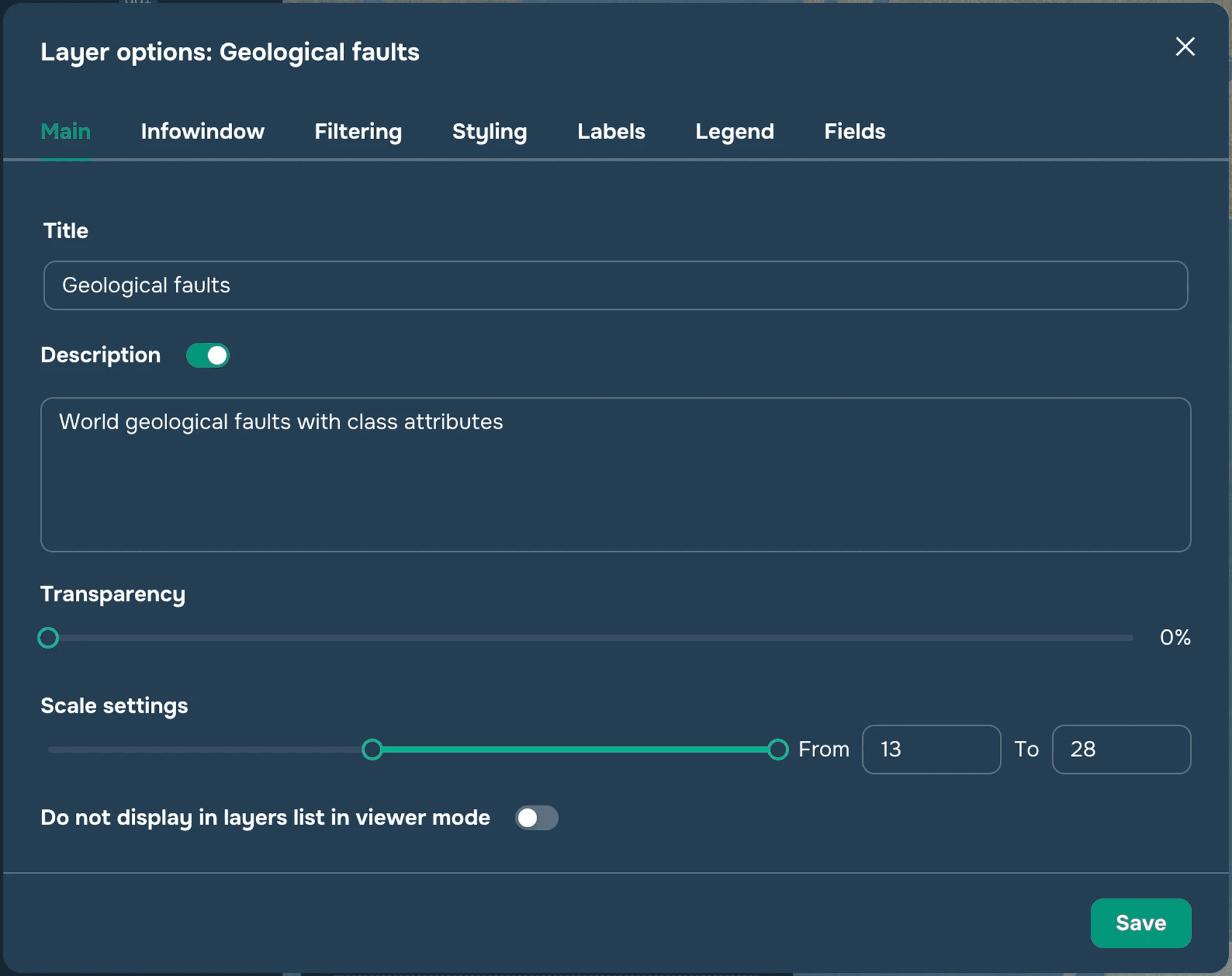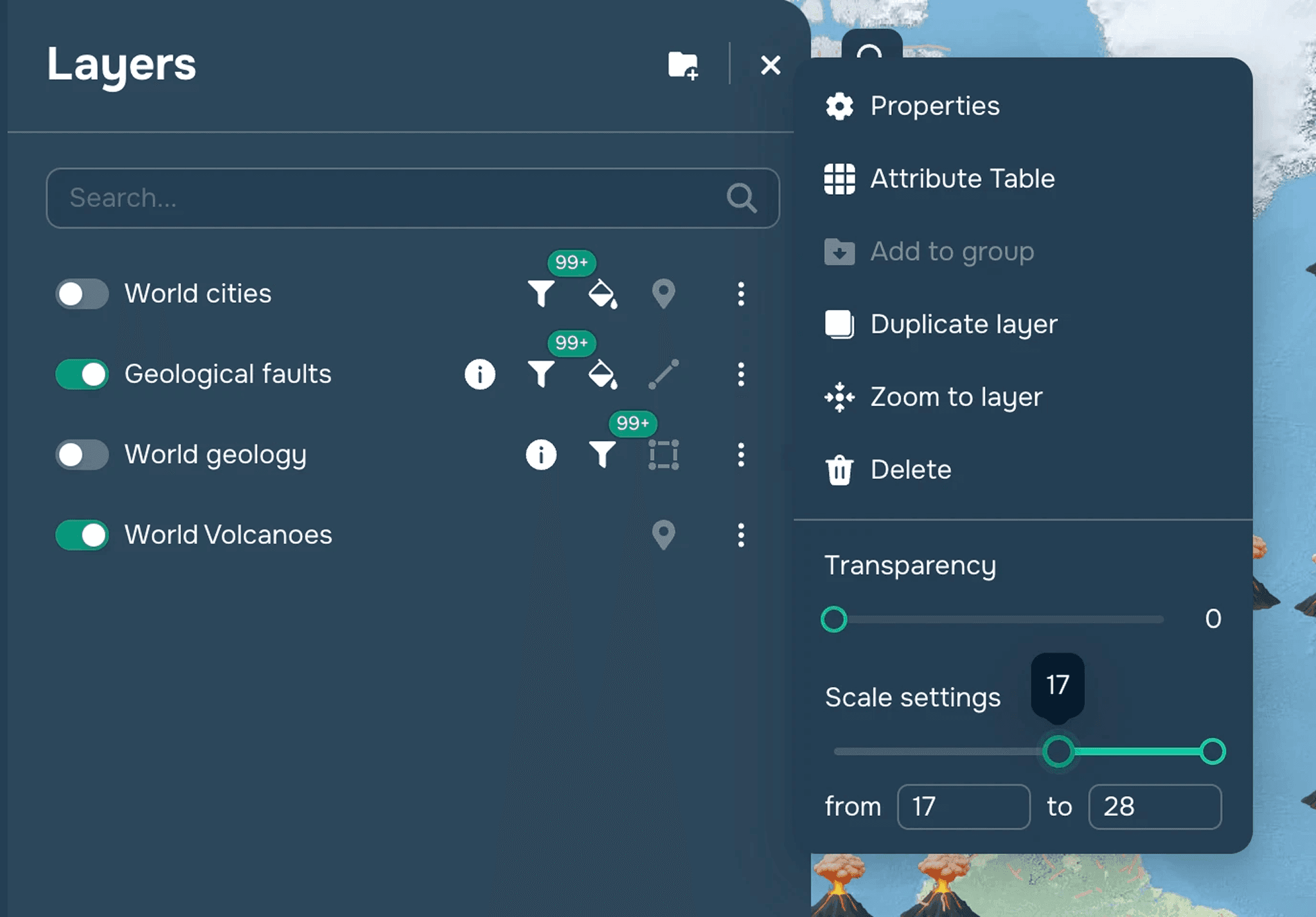 This widget allows you to change the visibility settings of a layer depending on the zoom level of a map. To configure the visibility of layers, you need to click on the three dots next to the layer name and set minimum and maximum zoom levels within which this layer will be displayed (figure 1).