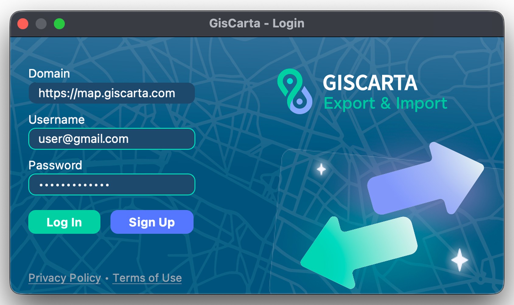 To log in to the plugin, you need to have an account on the GISCARTA platform and enter your login and password. Your plan can be anything from Basic to Pro.