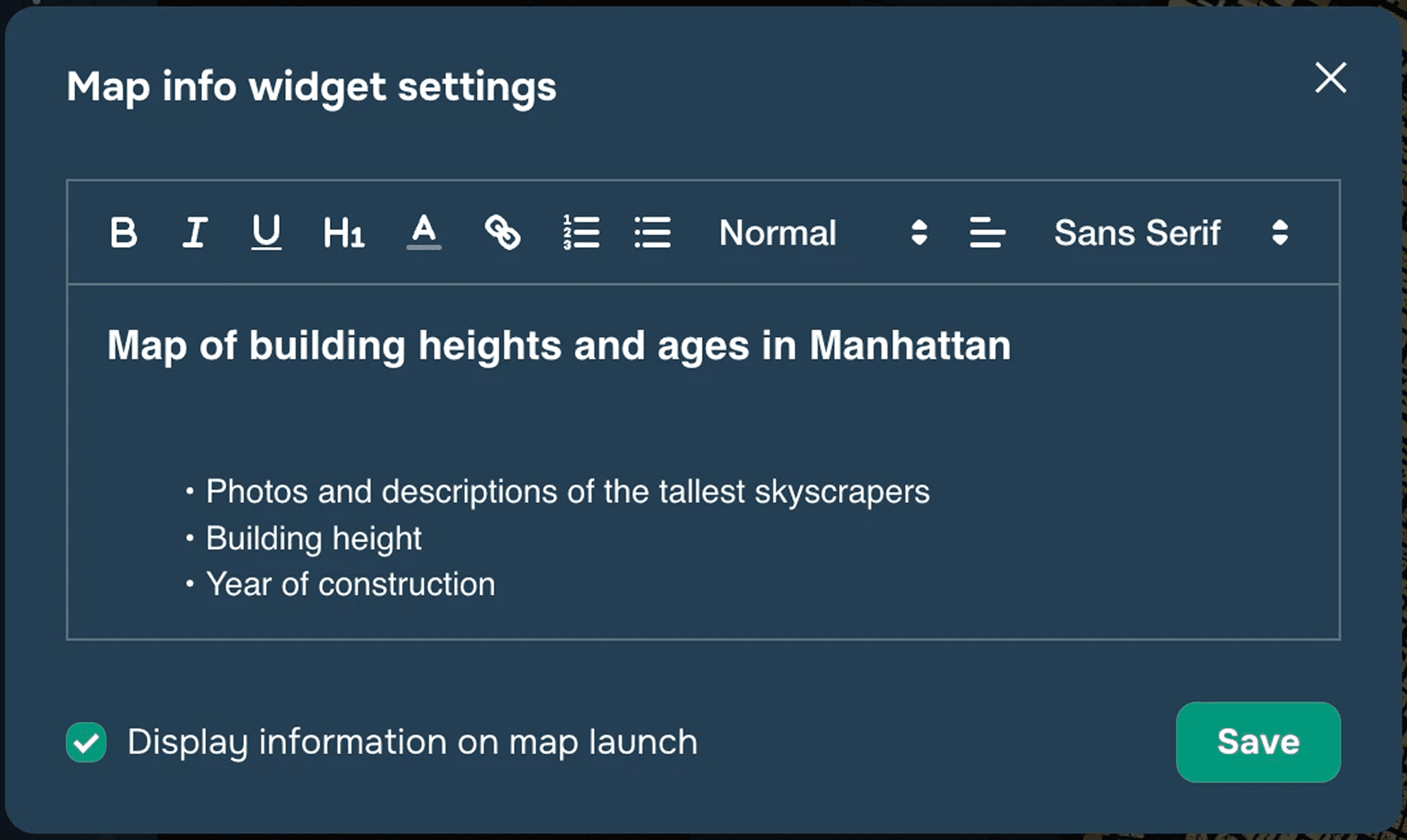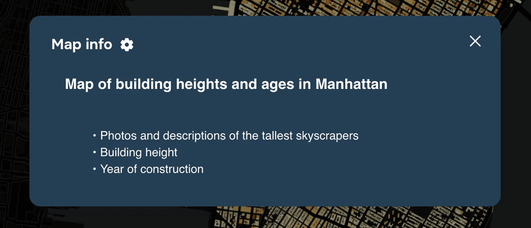 Find the widget icon that appears in the upper right corner of the map. Click on it to display a modal window with information about the map.