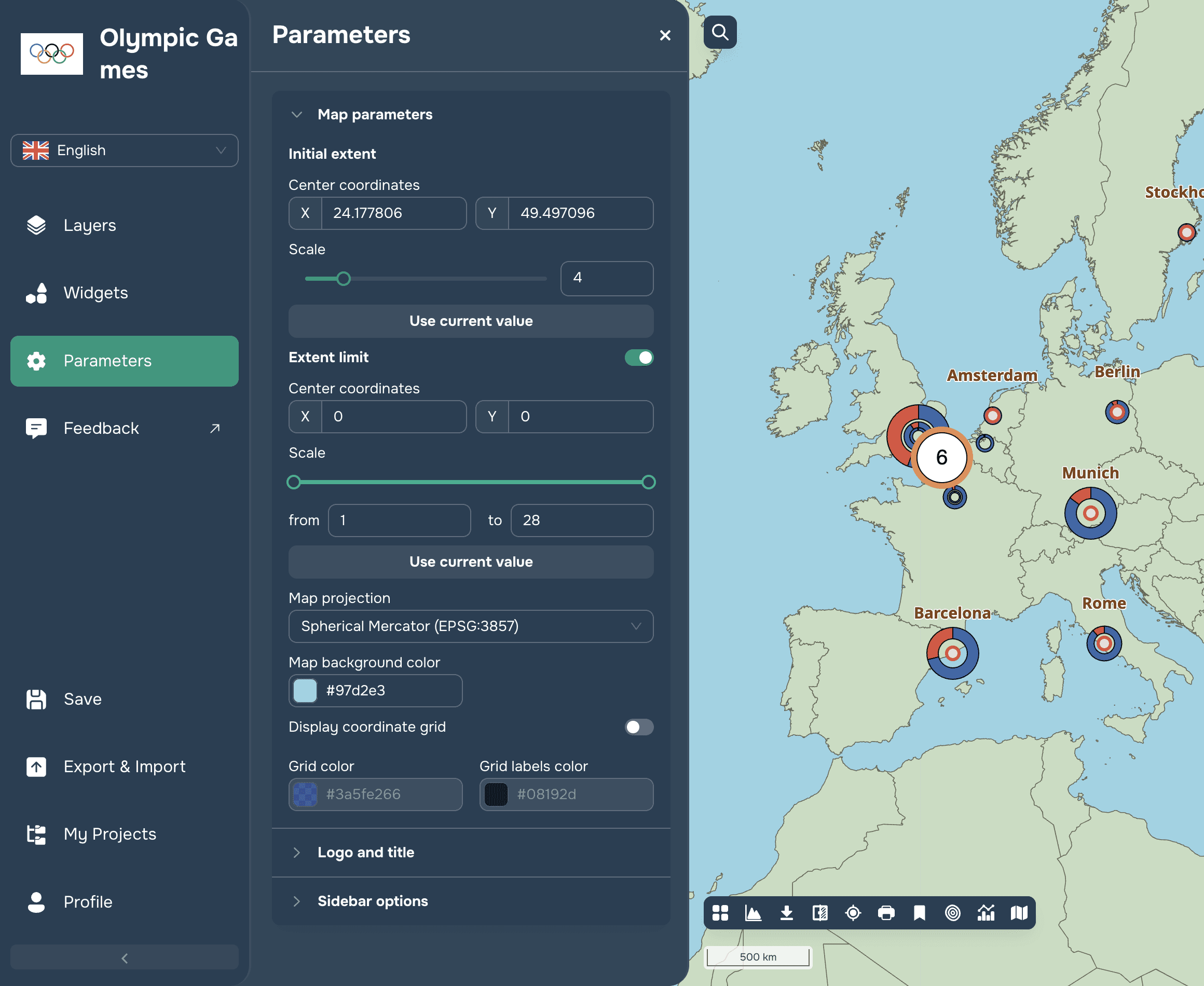 This is where you can configure the map’s initial extent, i.e. what part of the earth’s surface you see when you open the application and at what scale. You can extent limit (zoom in and zoom out).