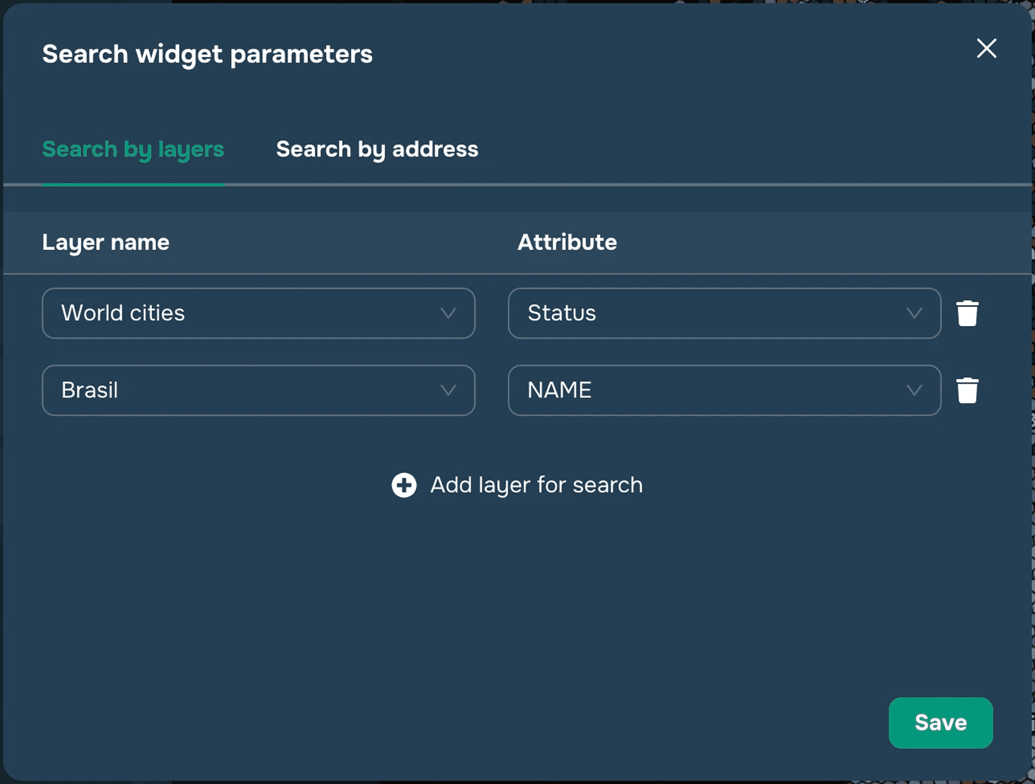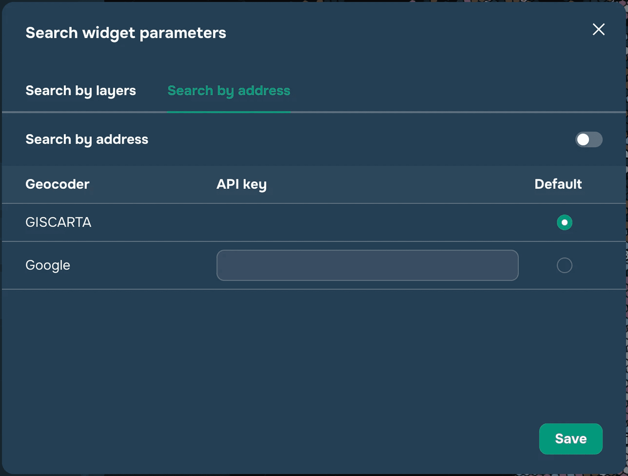 Next, if you want to add a search by layer objects (see Figure 1) — select the "Search by layer" tab and select the layers and their attributes to search in the corresponding dropdown lists. For each layer, the search is available for one selected attribute. If you want to add an address search (see figure 2), you need to select the "Search by address" tab and switch the corresponding checkbox to the active position. Next, select the geocoder you want to use (GISCARTA and Google geocoder is currently available (Google requires API key). Other geocoders will be available soon).
