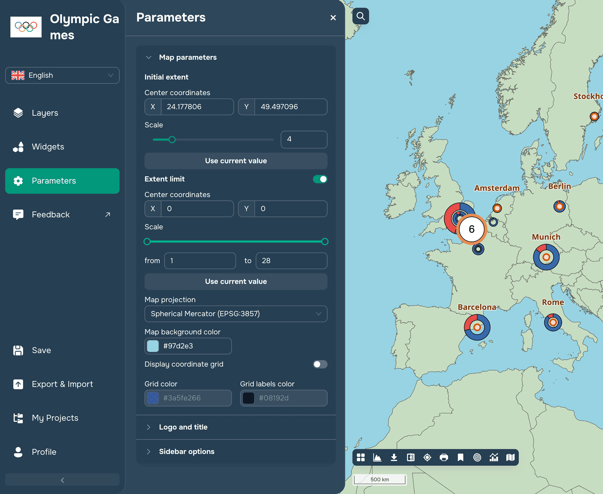 This is where you can configure the map’s initial extent, i.e. what part of the earth’s surface you see when you open the application and at what scale. Also you can adjust the extent limit (zoom in and zoom out).