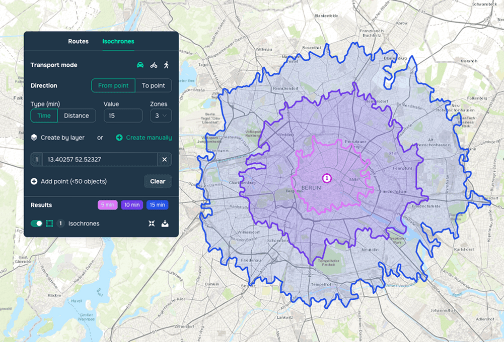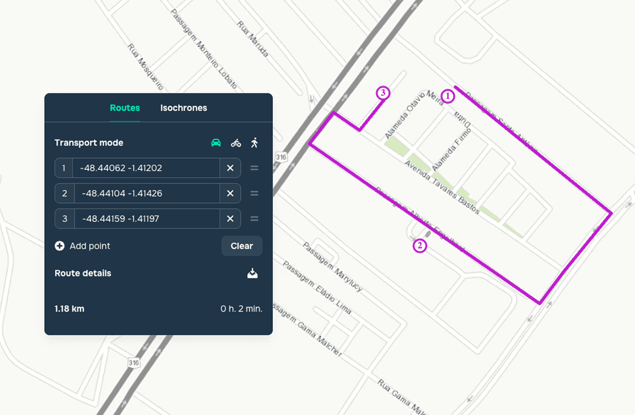 To enable the widget, click on the corresponding icon on the map. After opening the widget, a dialog box appears on the map (see Figure 2) allowing you to choose between generating routes or transport accessibility zones. To generate routes, you must place at least two points on the map. After placing two or more route points on the map, the user can select the mode of travel (car, bicycle, on foot) on which the route will be based.