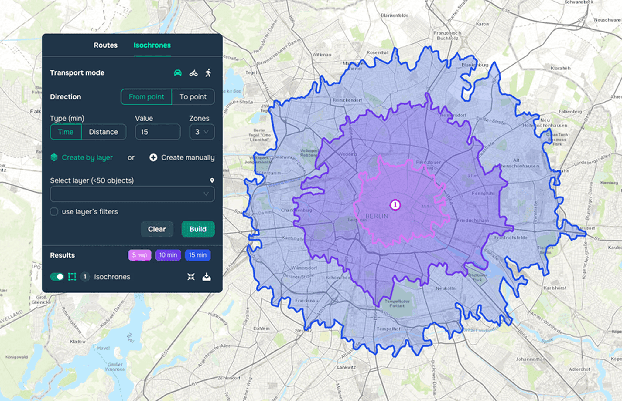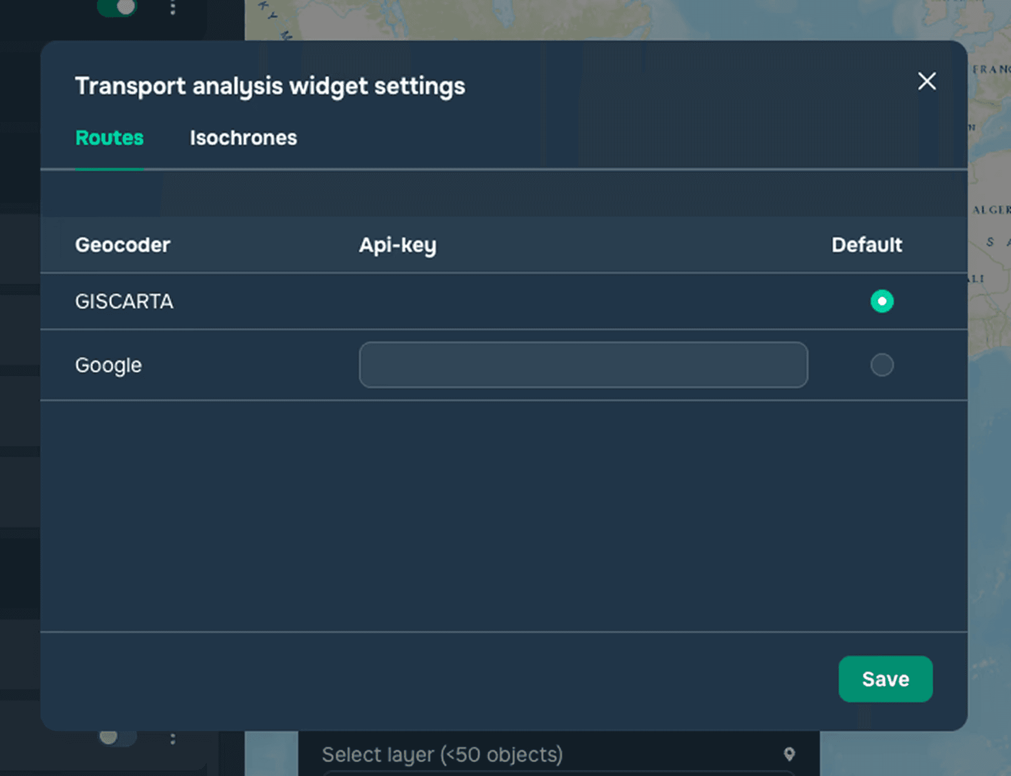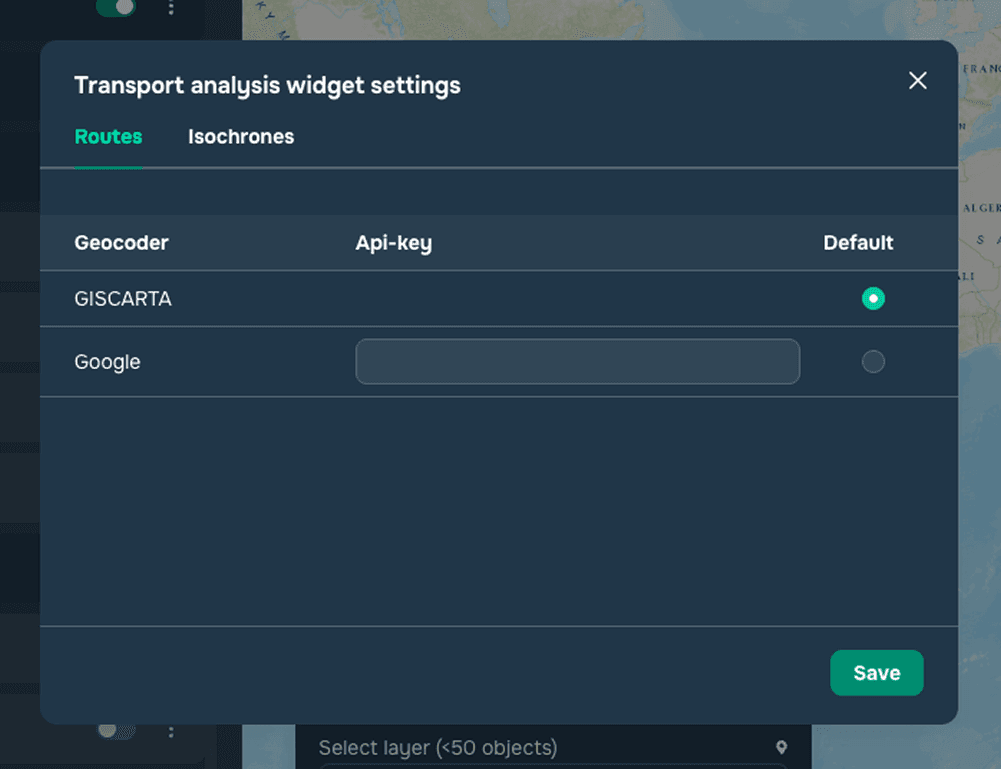 In the widget settings (see Figure 1), you can select a service for generating routes and isochrones (currently, the GISCARTA's source is available).