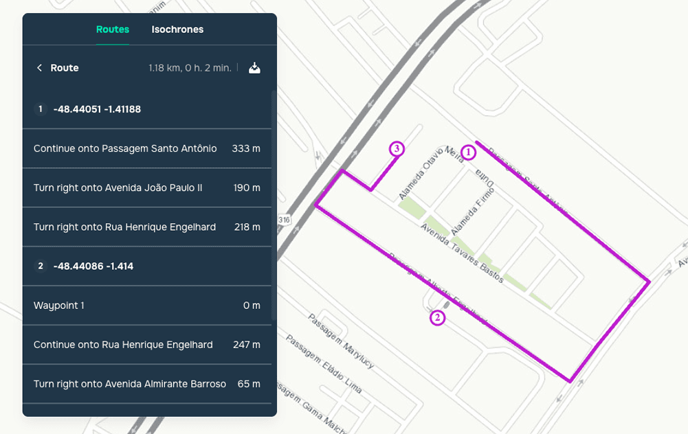 The user can also reorder the route points or view route details by clicking on the displayed route (see Figure 3). The resulting route can be downloaded to Data Sources and to the map.