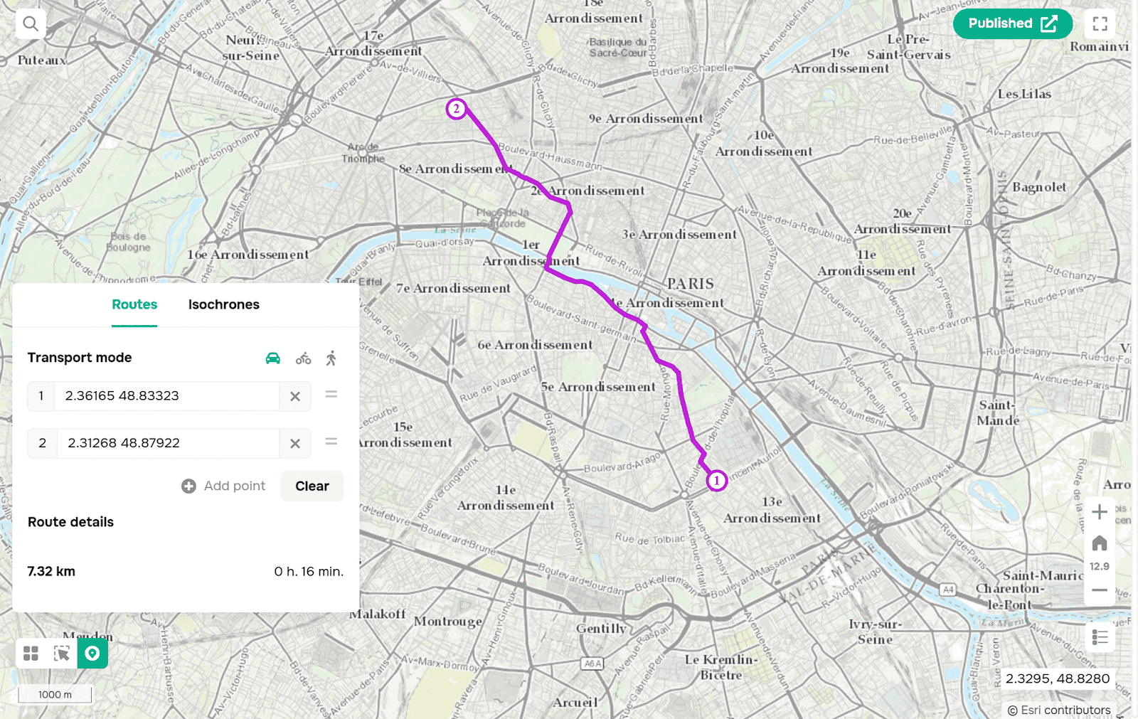 The widget allows building isochrones from a single point or from multiple starting points at once. This makes it possible to compare accessibility from different locations and visually assess overlapping or competing service areas.