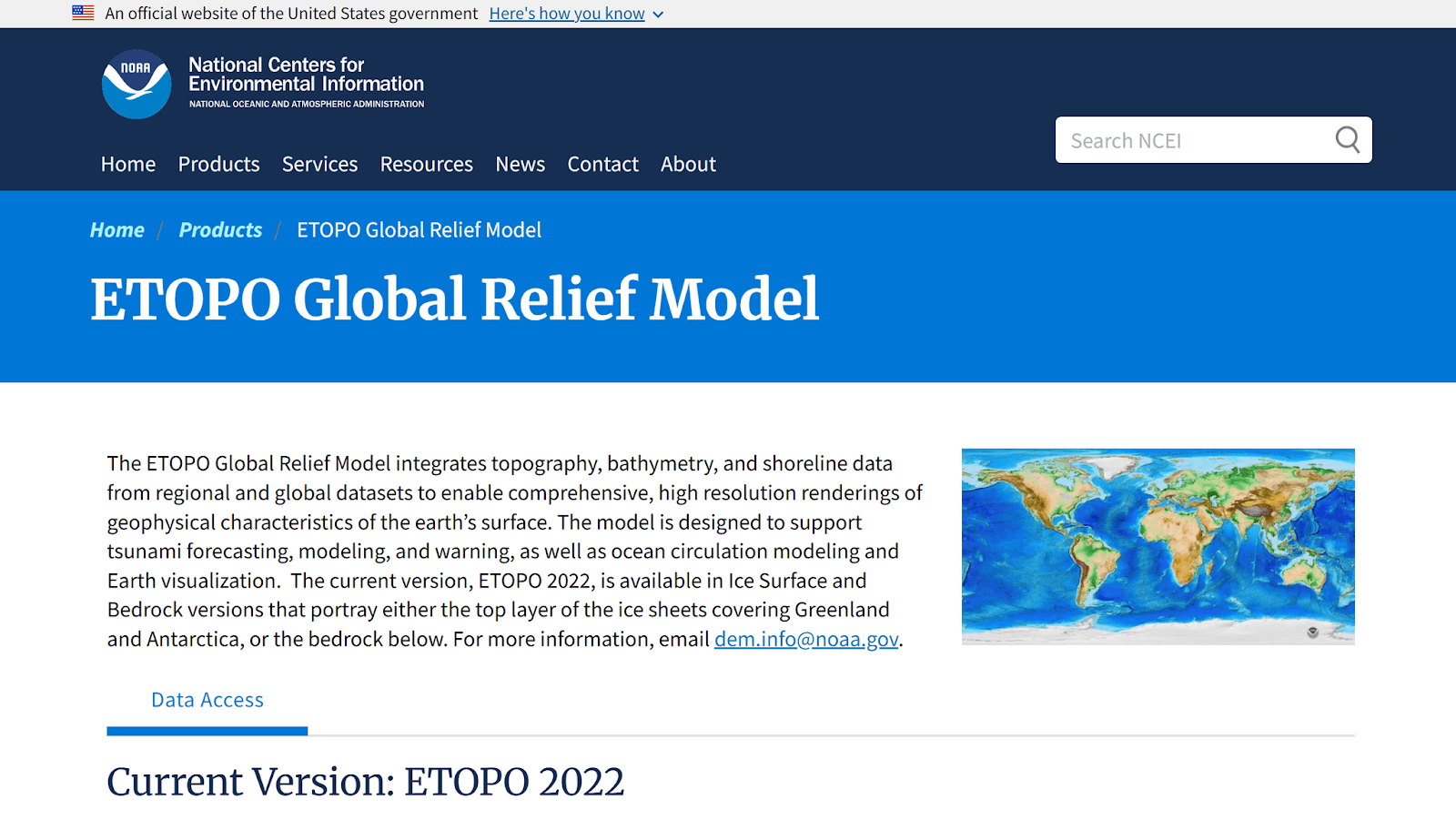 ETOPO is a global digital elevation model that integrates land elevation and ocean bathymetry data. It is often used in global and survey studies, natural process modeling, and visualization.