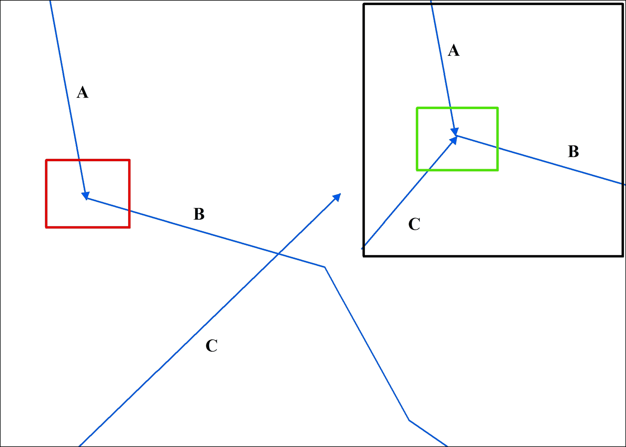 An example of a topology error involving intersecting/overlapping lines. Line C overlaps line B, which is an error and should be trimmed at the junction of lines A and B (red box). The correct solution to this error is shown in the green box in the inset. Source: USGS.gov