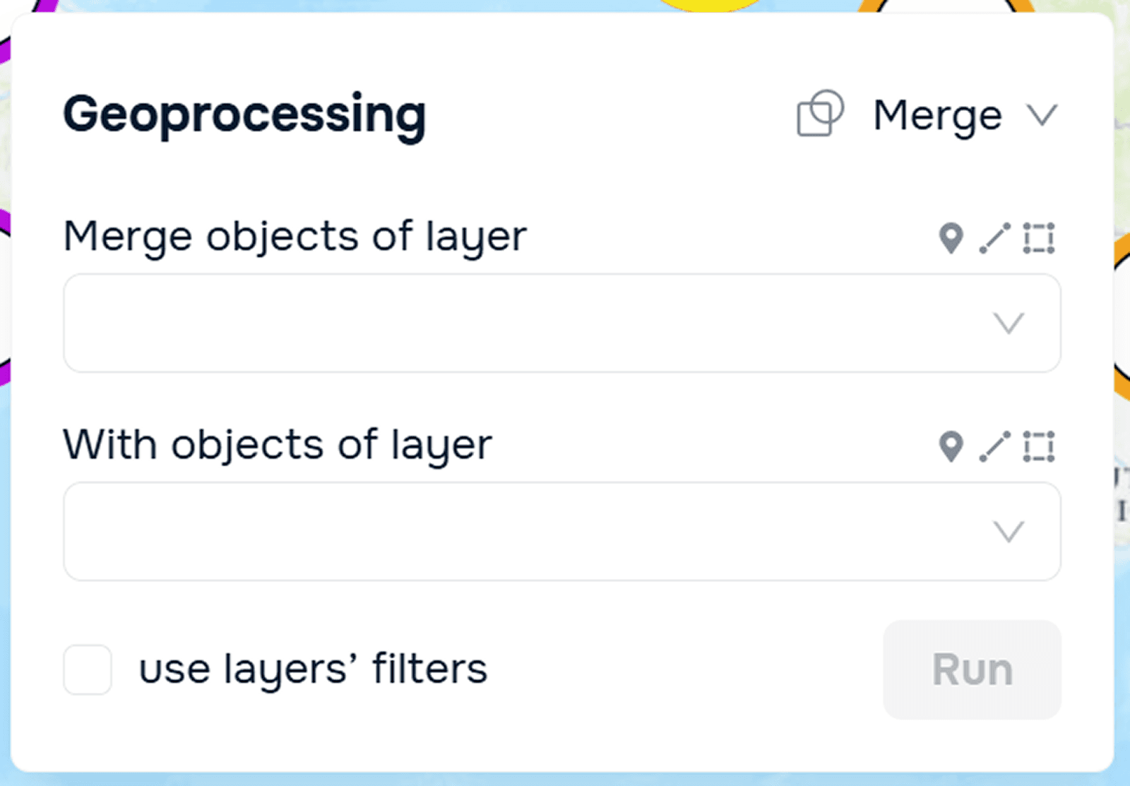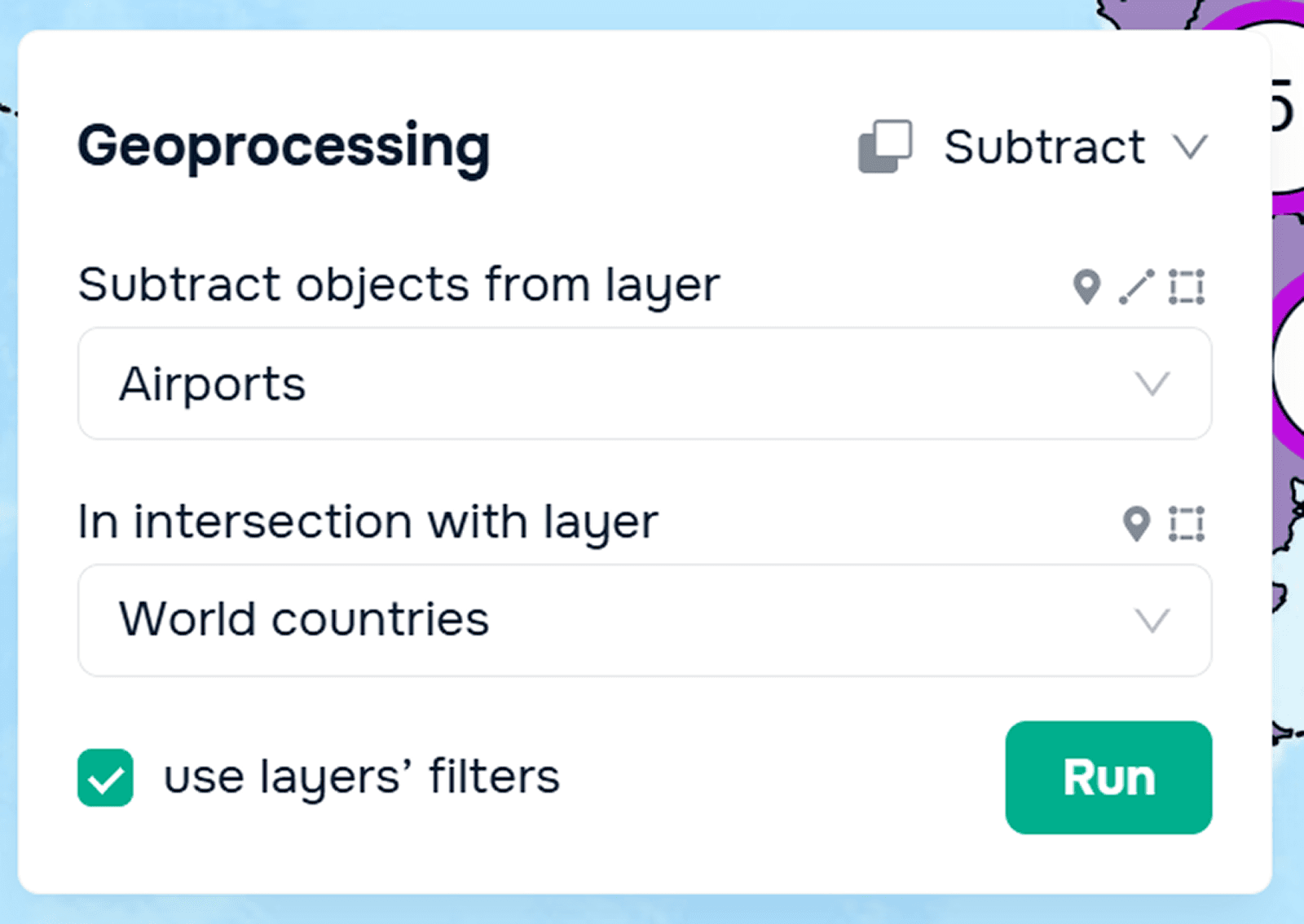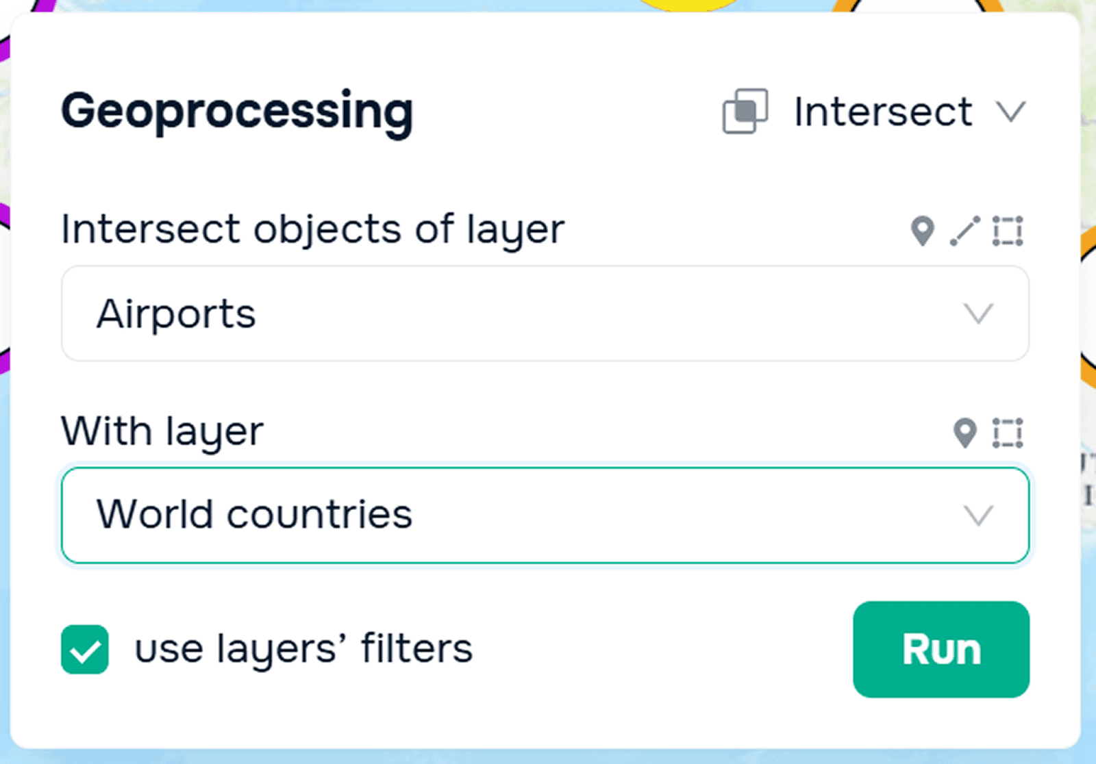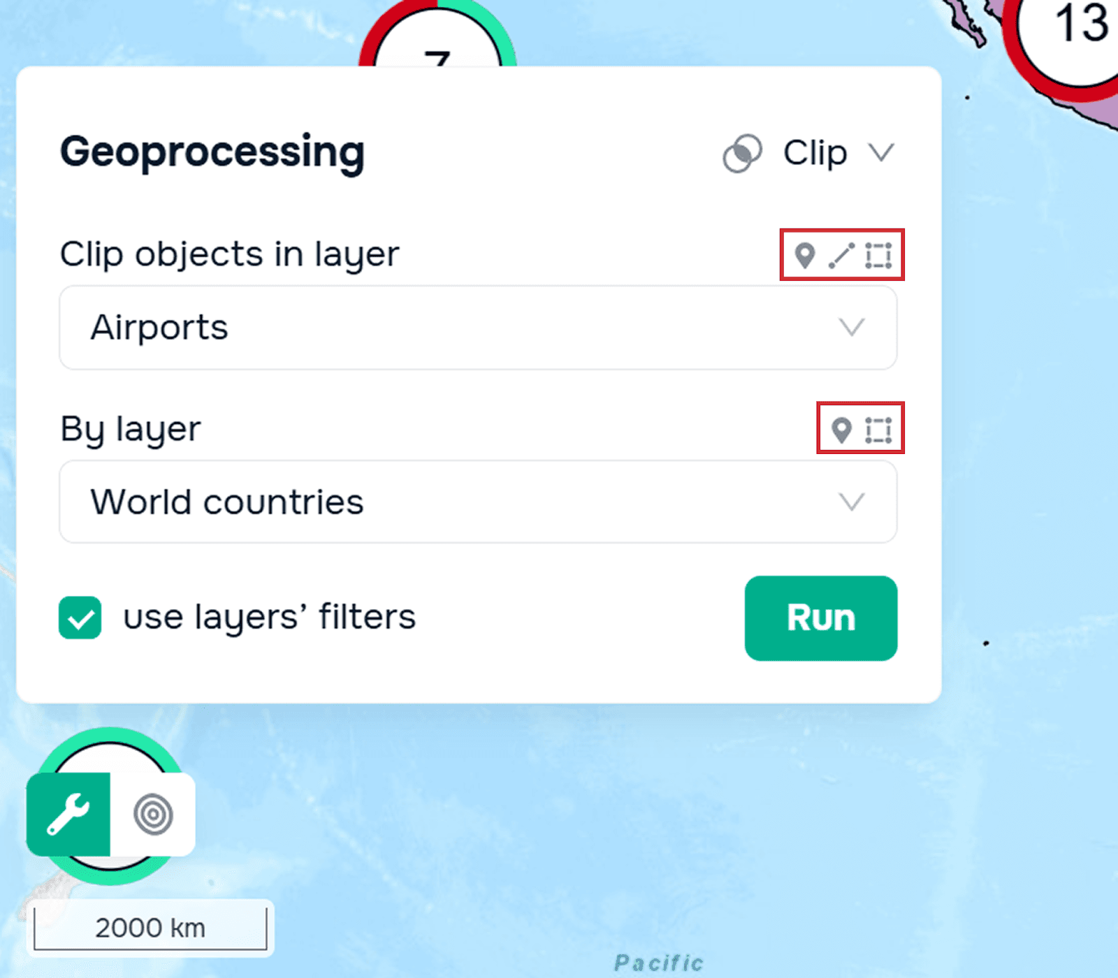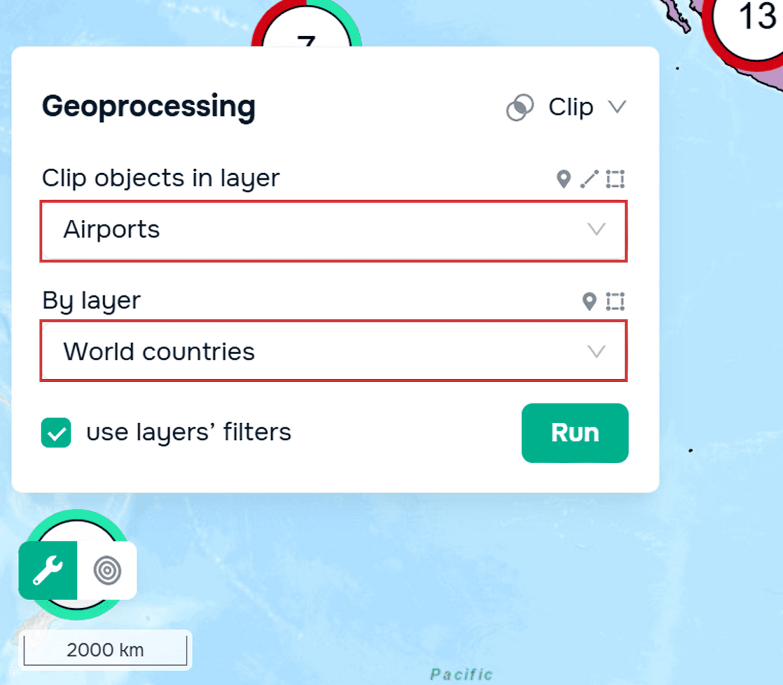 To work with this tool, you need to select the layer that we want to crop and the layer by which we will crop. You can also take into account the enabled filters in layers.