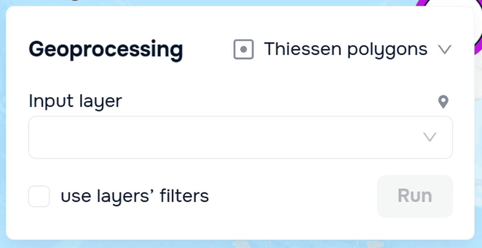 A tool that creates polygons defining areas of influence around each input point. You must select a point layer around which these areas will be built.