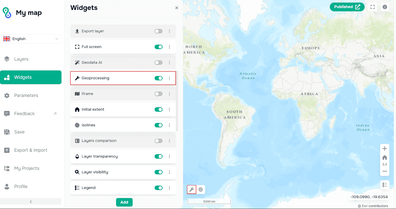 The Geoprocessing widget in GISCARTA provides an intuitive, step-by-step workflow with downloadable results.
