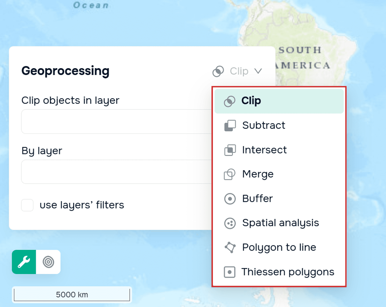 Step 2. Next, in the upper right corner of the widget window, you need to select the type of geoprocessing from the drop-down list that opens when you click Clip.
