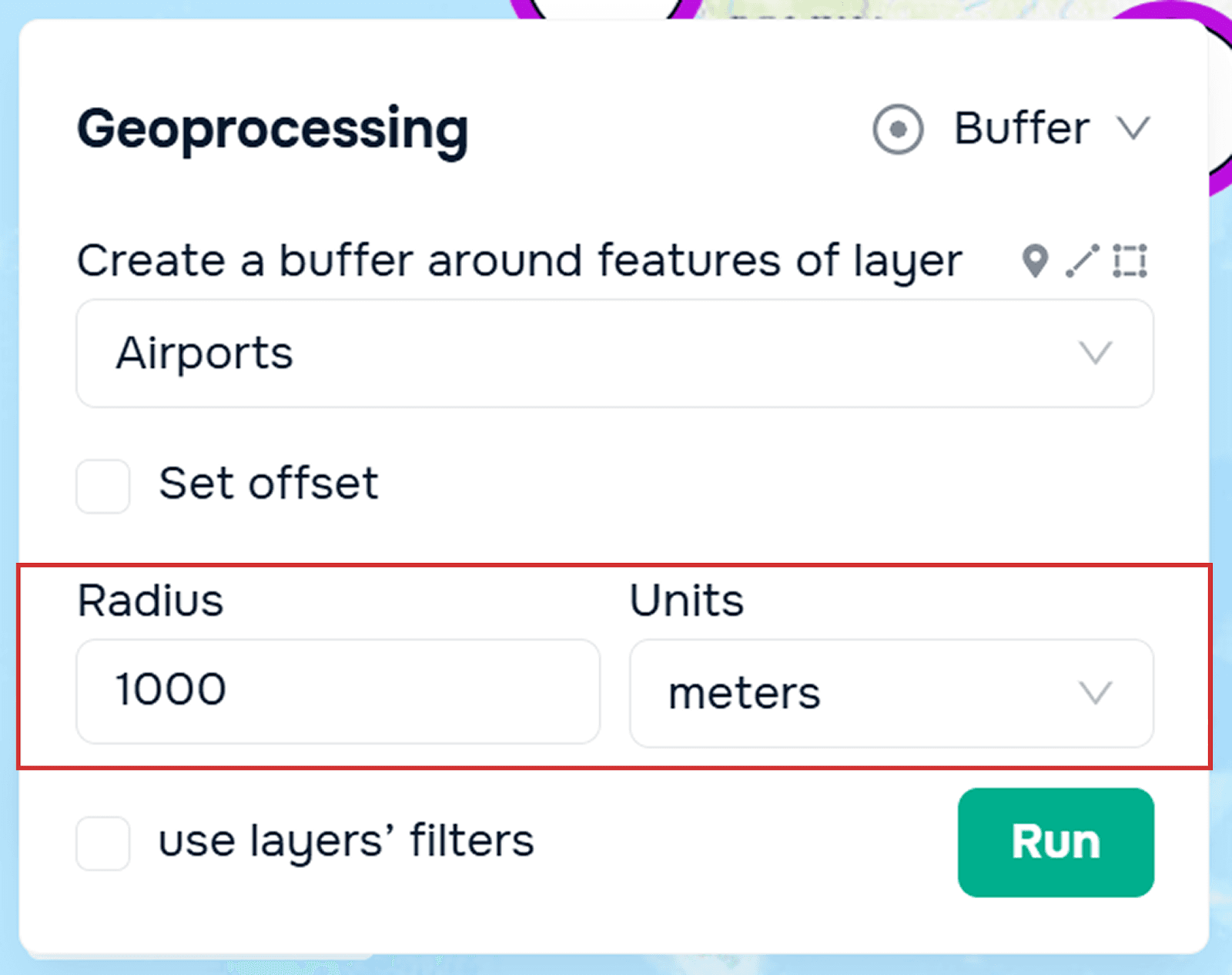 This tool allows you to create a buffer zone around an object with a specified radius. In the widget window, you can configure the radius and units of measurement.
