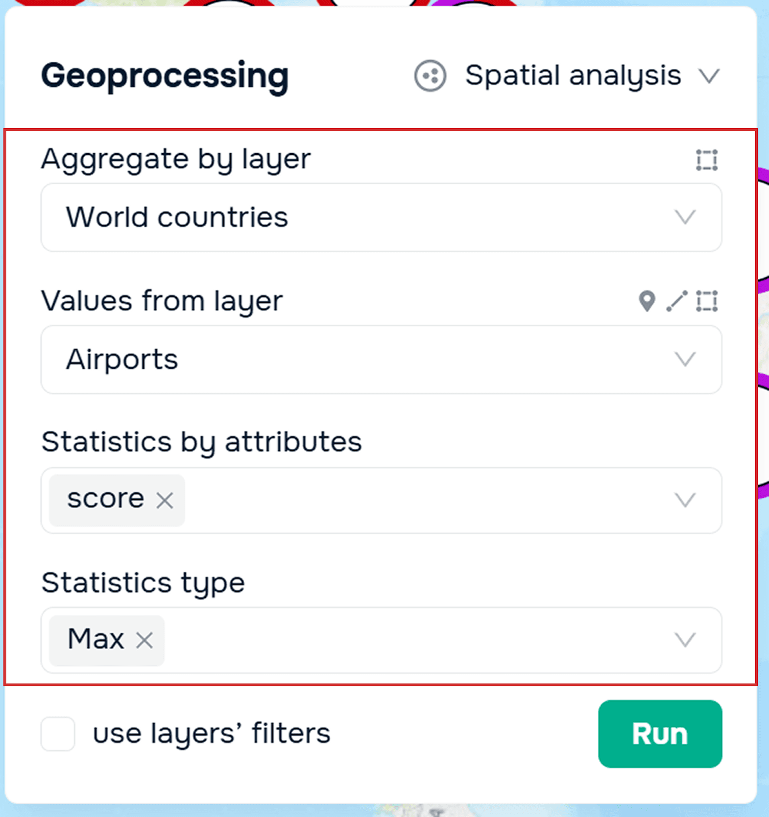 To use this tool, you need to select one polygon layer to which the obtained values will be attached. Next, select the layer for which statistics will be generated (this can be any geometry). Then, select the numeric attribute for the calculation. Finally, select the calculation type: min, max, mean, or sum. The result is a new polygon layer based on the first one with an additional attribute for statistics.