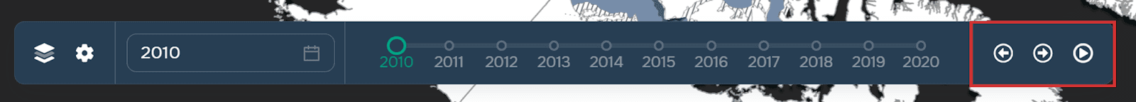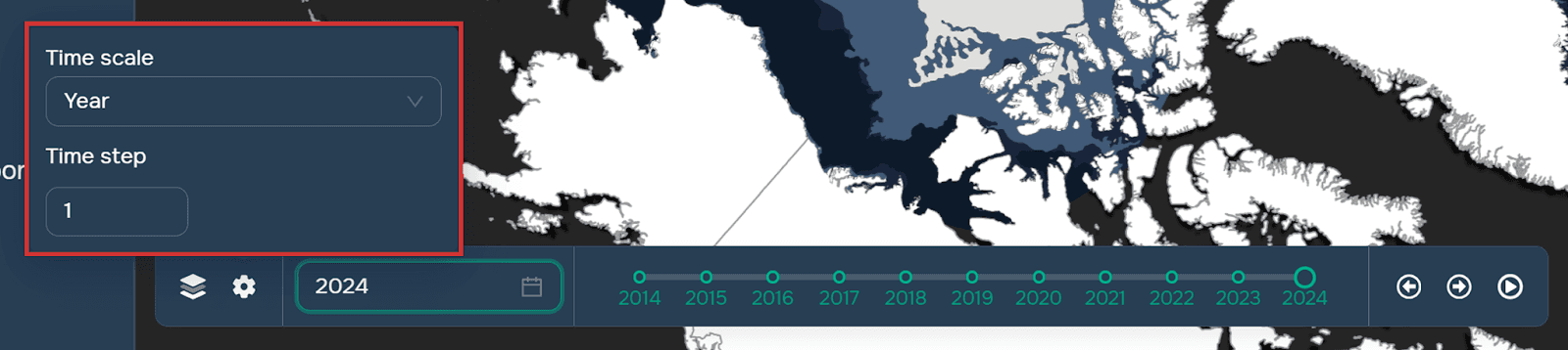 Step 3. Configure the widget's timeline (years, months, days) and its step size. You can do this by clicking the gear icon in the widget window. It's worth noting that you can also select the timeline and step size of the source layer so that data is only taken from the periods specified in the attributes.