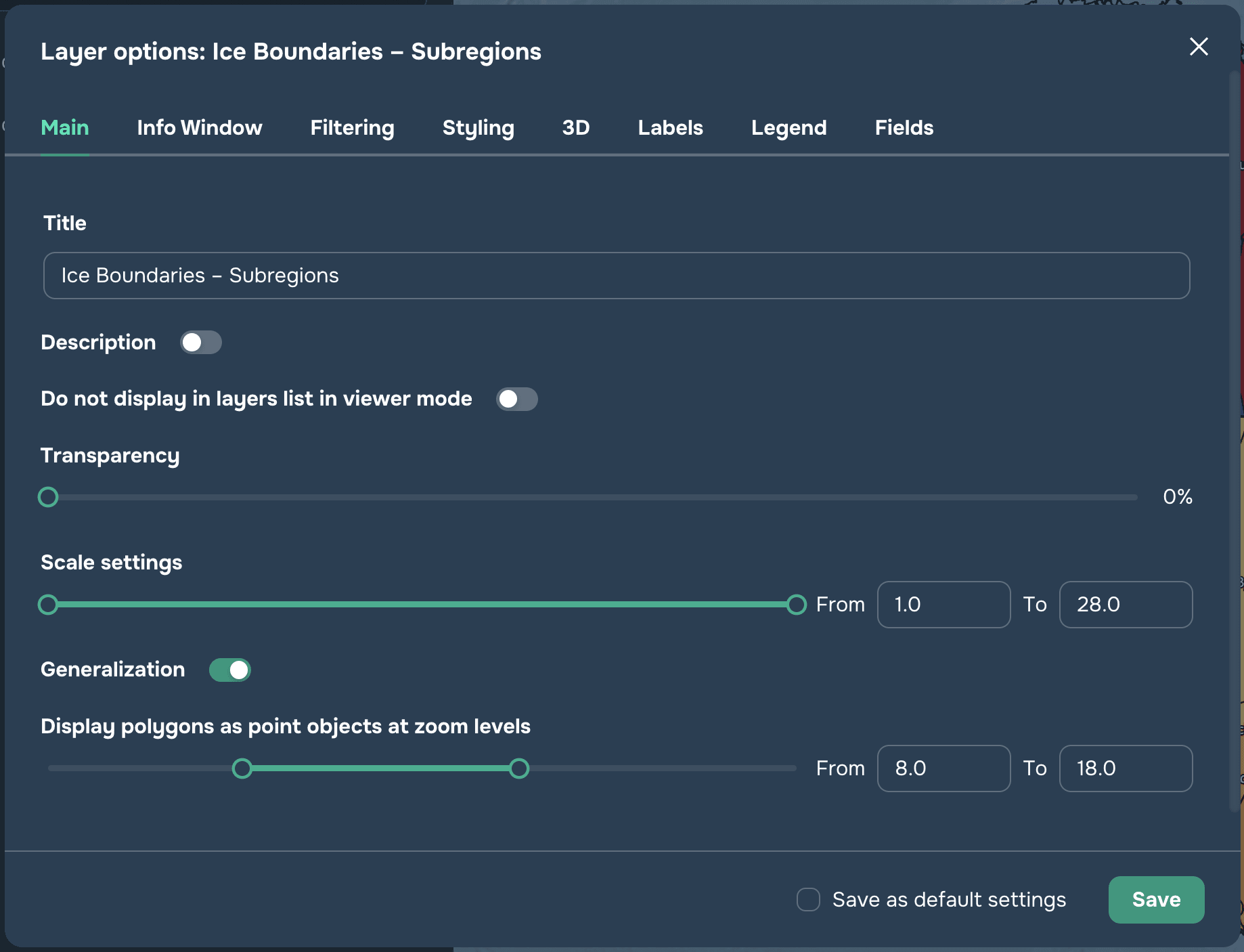 Para capas de polígonos y puntos, configurar la generalización de objetos. Para puntos, esto significa si todos los objetos se mostrarán a la vez o si se habilitará la generalización automática dependiendo del nivel de zoom del mapa. Para polígonos, esto significa conversión automática de polígonos a puntos en ciertos niveles de zoom.