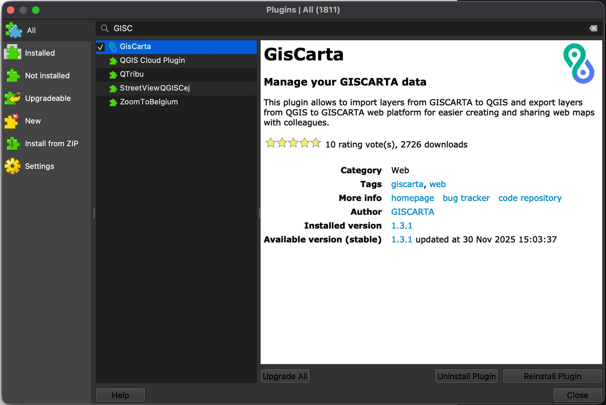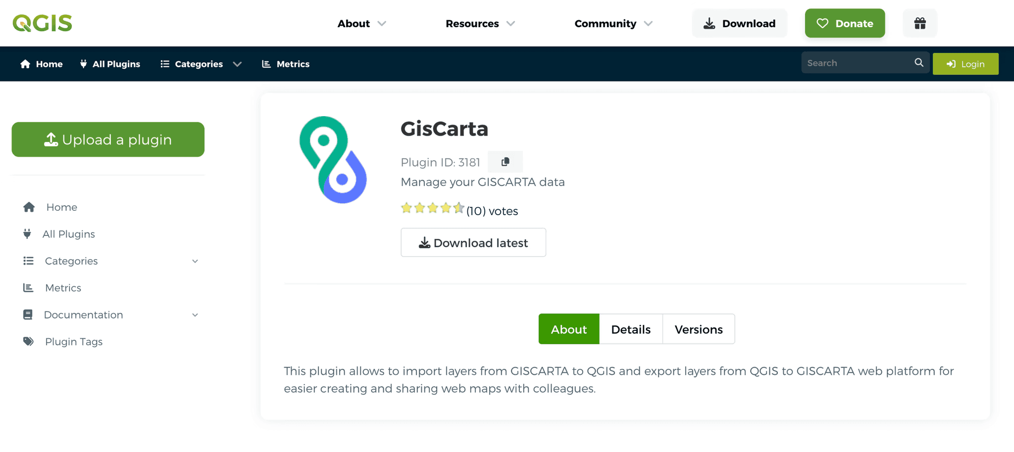 Para instalar el complemento GISCARTA en QGIS, puede utilizar el método estándar de instalación del complemento mediante el administrador de complementos o descargar el archivo desde el enlace del sitio web oficial.