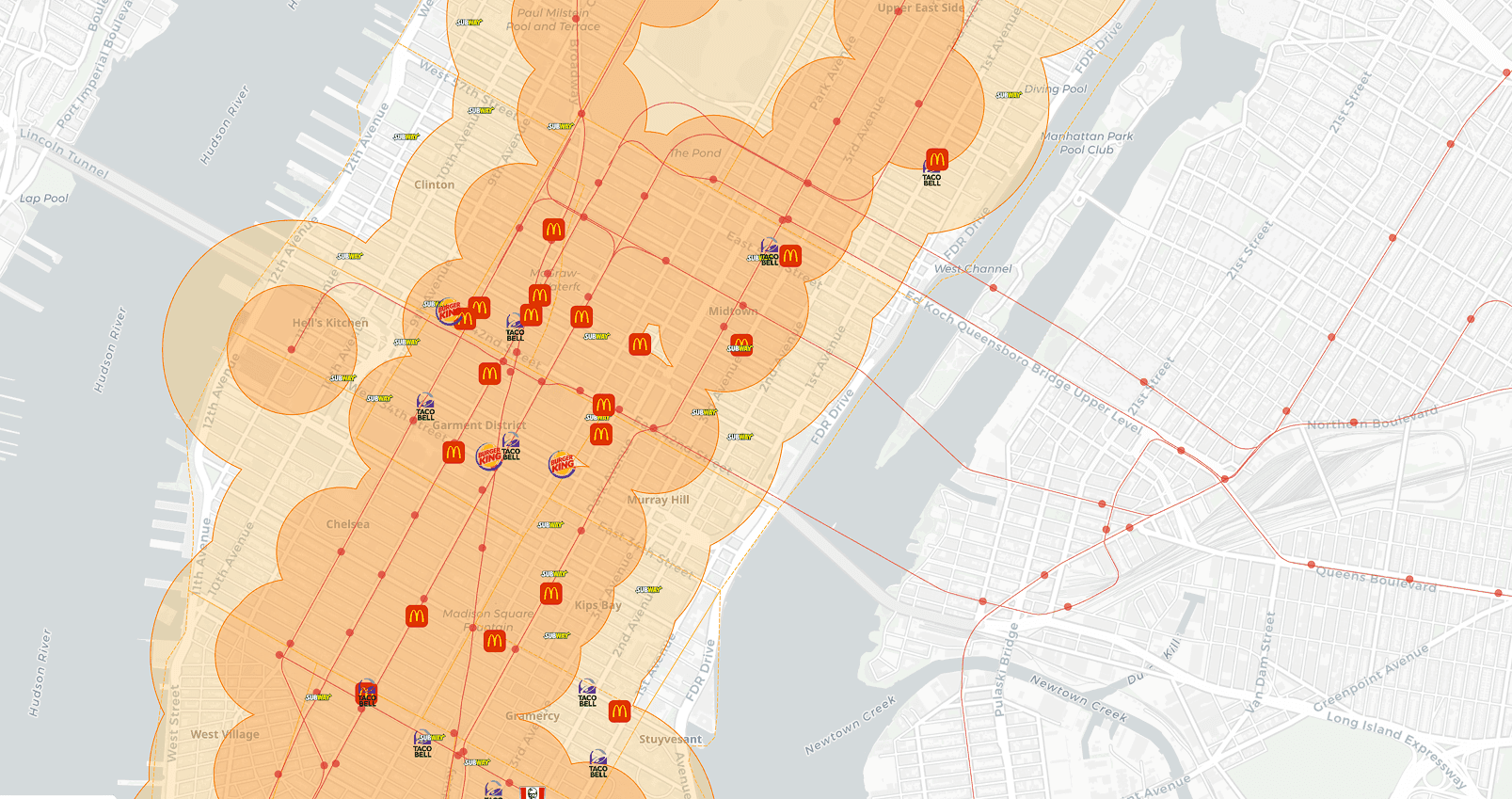 Create live maps that highlight trade areas and KPIs. Build dashboards to track store density, median income, or travel times.